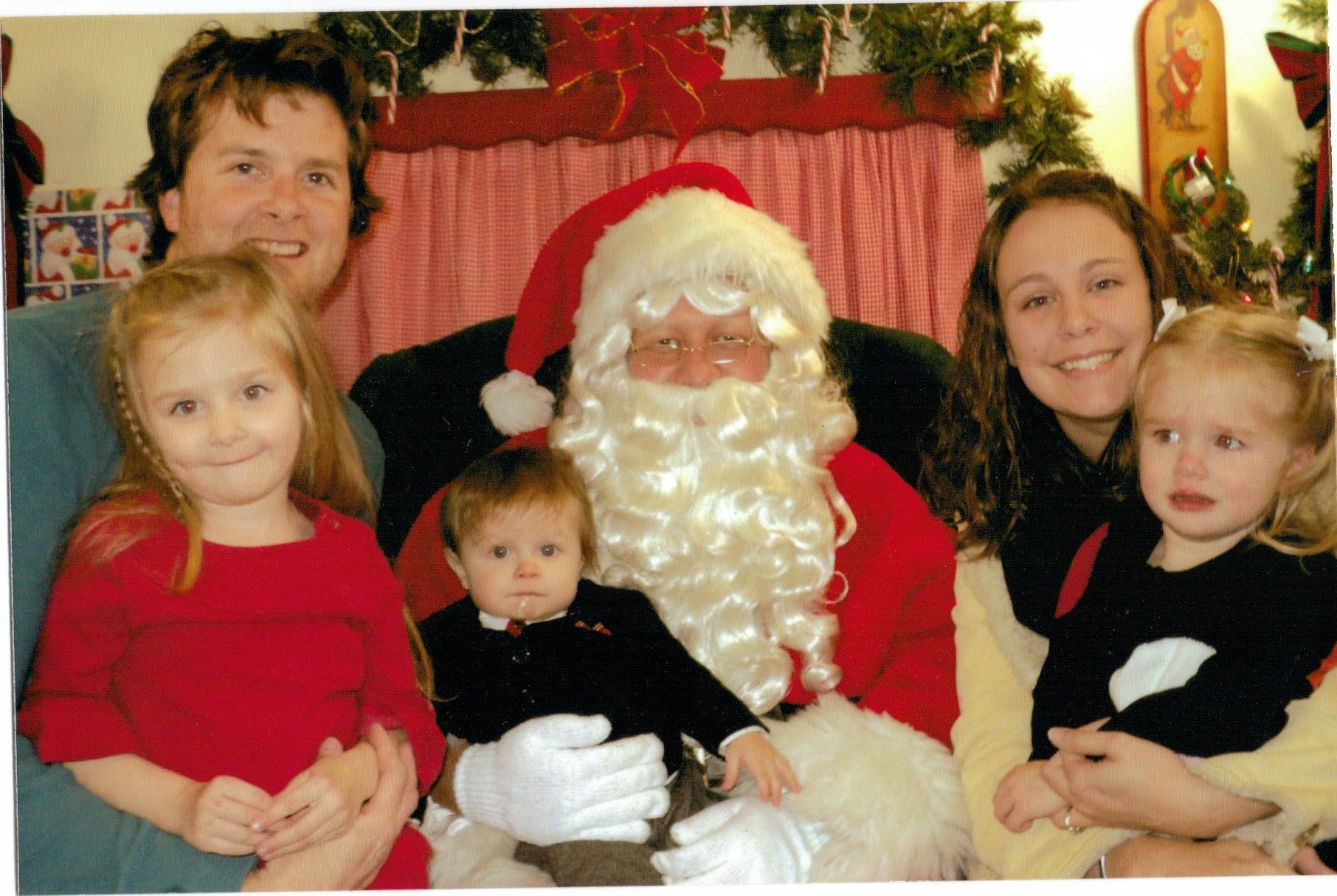 The first of which I will tell you about is our hilarious trip to see Santa Claus… We loaded the kiddos the Thursday before our Friday open house to take a break from cooking and cleaning and go visit Santa. The goal, make memories with our three little ones. We picked Katie up from her last day of Preschool for the year and she had just finished her preschool christmas party and got into the car with a very loud horn/noisemaker. This began a series of lots of noise and a crying jealous Bella. Then we ran by the house to pick up our dress clothes to put on once we got to Santa for a decent picture. After finally arriving in Tulsa… Quick explanation as to why we go all the way to Tulsa for Santa. In Utica Square Santa has his own little house and each family can go in one family at a time and sit with Santa and Mrs. Claus in his little living room by his Christmas tree. Then the family gets to use their own camera or Mrs. Claus uses hers to get a few pictures and she prints them off right then and frames it in a Utica Square 2010 frame. Next Mrs. Clause gives each child homemade warm cookies…. This whole experience and the picture and frame for only 5 dollars a family! Its very sweet and magical and my favorite, CHEAP! Ok back to our trip. We arrive and I’m on the phone with mom and Eric is anxious to get the kids to Santa so he gets in the back to start changing their clothes while I finish up on the phone. Well when he starts changing Noah he realizes he had his biggest blow out poopy diaper to date 😦 let’s just say all his clothes were covered, the carseat, Eric, the car, and eventually I was even covered before it was all said and done. Finally dressed up nicely and cleaned up too we made our way to Santa’s cute little house. We got just inside the door and Bella (our 2 year old) lost it. She started screaming out of sheer terror and shaking, begging to leave. I finally got her to sit on my lap on a stool next to Santa and Katie sat on Eric’s lap on a stool on the other side of Santa. Noah sat on Santa’s lap. Just as Mrs. Claus snapped a picture, I heard Santa say, “HO HO HO! I think he just threw up!” Yes, Noah threw up (not spit up) all over his cute little suit, and Santa. Sooooo…. Mrs. Claus snapped a second picture and it was a bit worse. Bella just wanted to leave and poor Mrs. Claus was so flustered by the crying girl and the throw up covered baby/Santa she kept printing the wrong picture. Finally she printed the correct one and gave the girls cookies so we could leave. But Katie just kept asking Santa for a “walker”…. Yes Santa thought asking for old people equipment was strange So we rushed them out thanking them and apologizing and laughing. Our photo is framed and memorable, Bella’s face is purple and she is crying and Noah has throw up all over his chin and suit and Katie just looks like she is embarrassed…