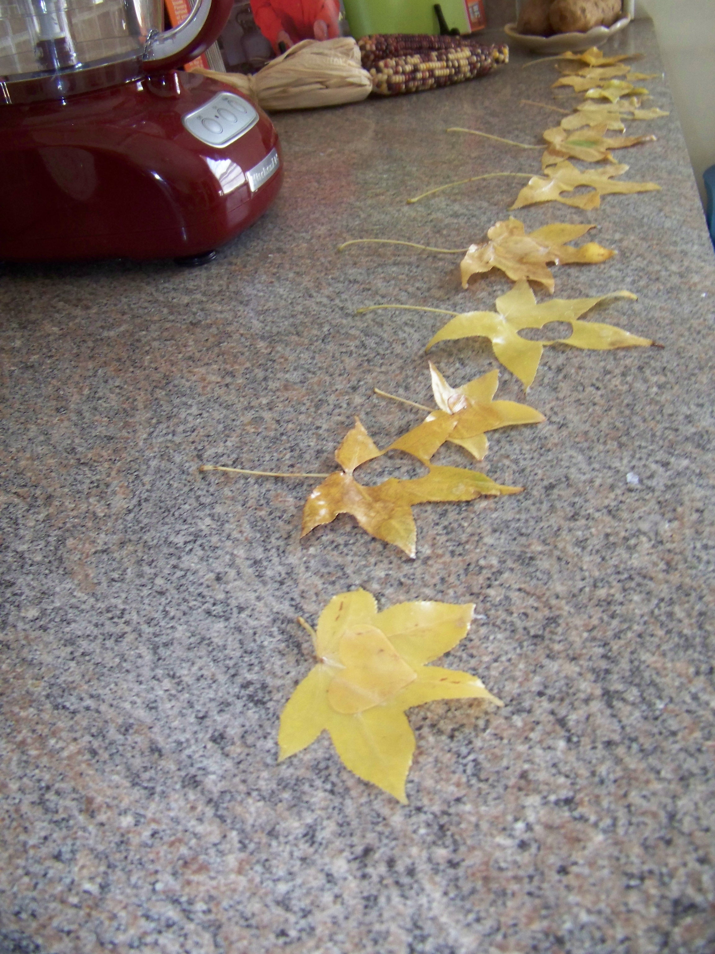 When they got up we used my scrapbooking heart punch and punched a heart out of the middle of half of the leaves and kept the hearts to put on the unpunched ones.