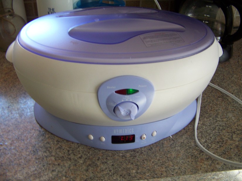 We are blessed to have two huge trees in our front yard that shed pretty yellow colored leaves each fall. My girls really love the leaves because they look like the “star leaves” from the kids movie Land Before Time. They call them dinosaur leaves. Well they have begun changing and falling, and even though our entryway now has a warm fall painting (from my previous post) I decided it was still too empty. The girls and I went out one day last week and picked a bunch of pretty yellow leaves and brought them inside and pressed them all morning and through nap time between wax paper under very heavy books. While they were napping I got out my paraffin wax melter I had gotten at a garage sale for 5 dollars brand new never used (great for feet and hands) and I melted some paraffin wax so it was ready to go when they got up.