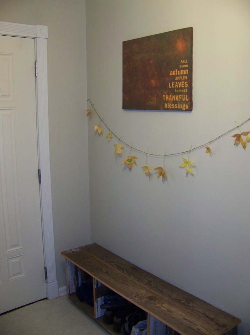 Next I took some twine from our gardening stuff and tied a single knot around each stem spacing the leaves approximately the same distance apart until they were all tied on and then I hung it in our entryway. Now I really love how fall it looks 🙂