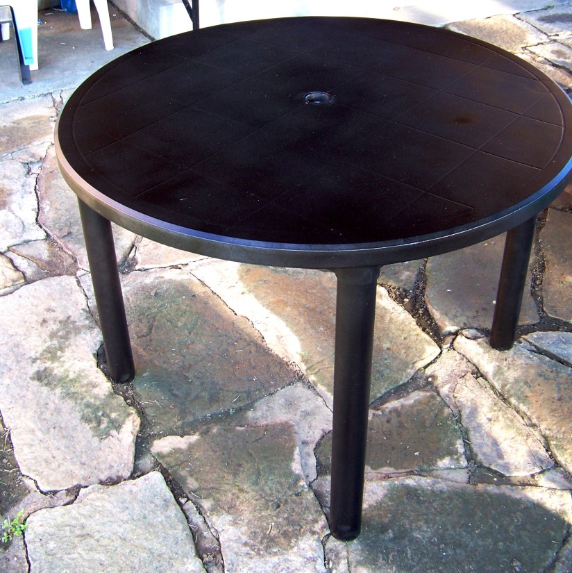 Tis the season for all the beautiful lawn furniture to make an appearance at all the major retailers right next to all the gardening stuff. I love gardening so I spend lots of time in this section, in the Spring. I usually look through the furniture and wish we could afford a nice outdoor set, well this year I decided to attempt to make what we have look better instead. When we moved into our current home there was a small white plastic table out back that had seen better days when we moved in almost 3 years ago.