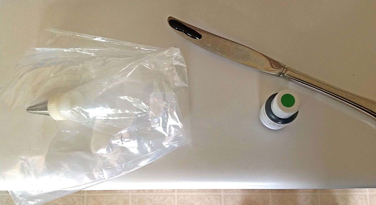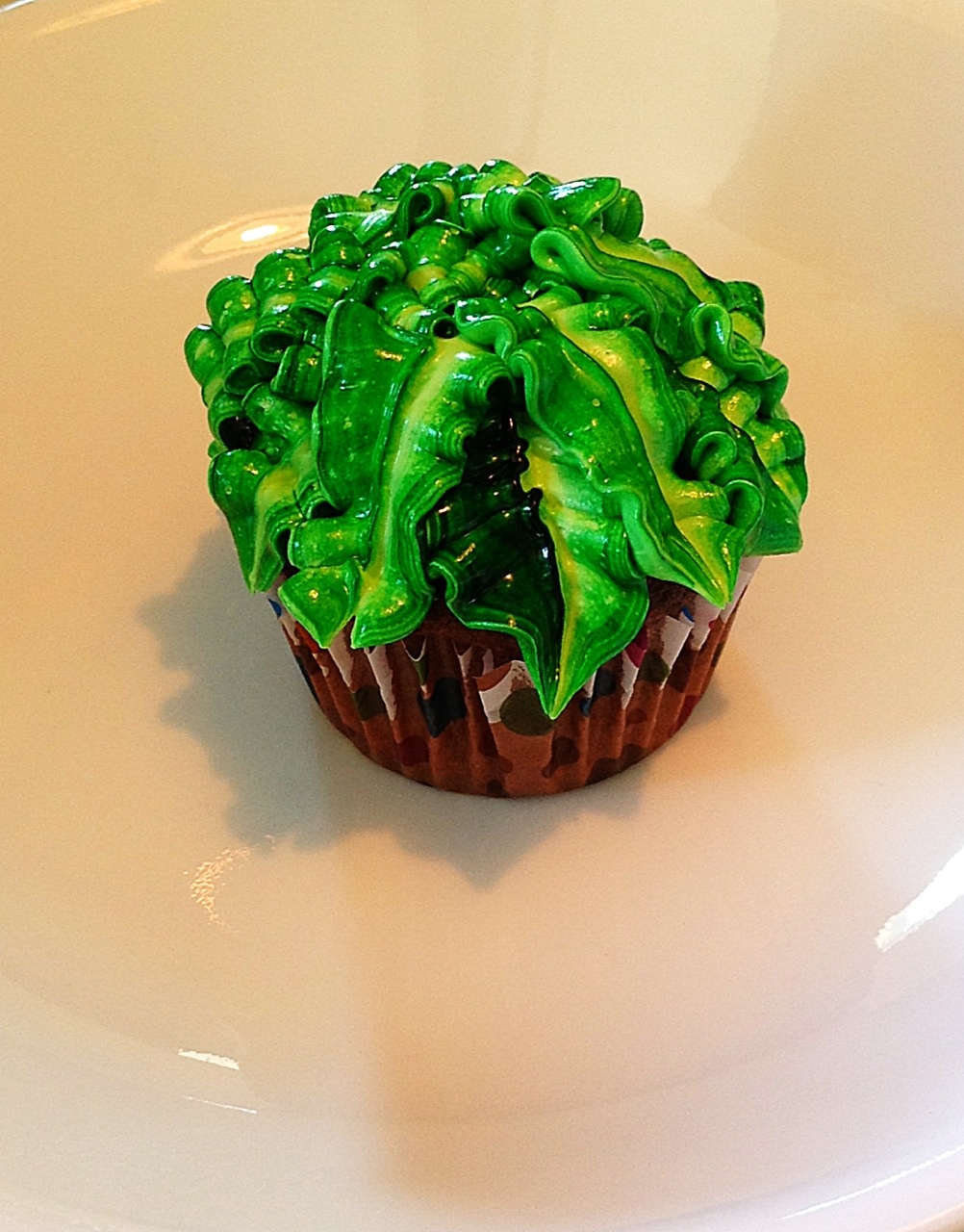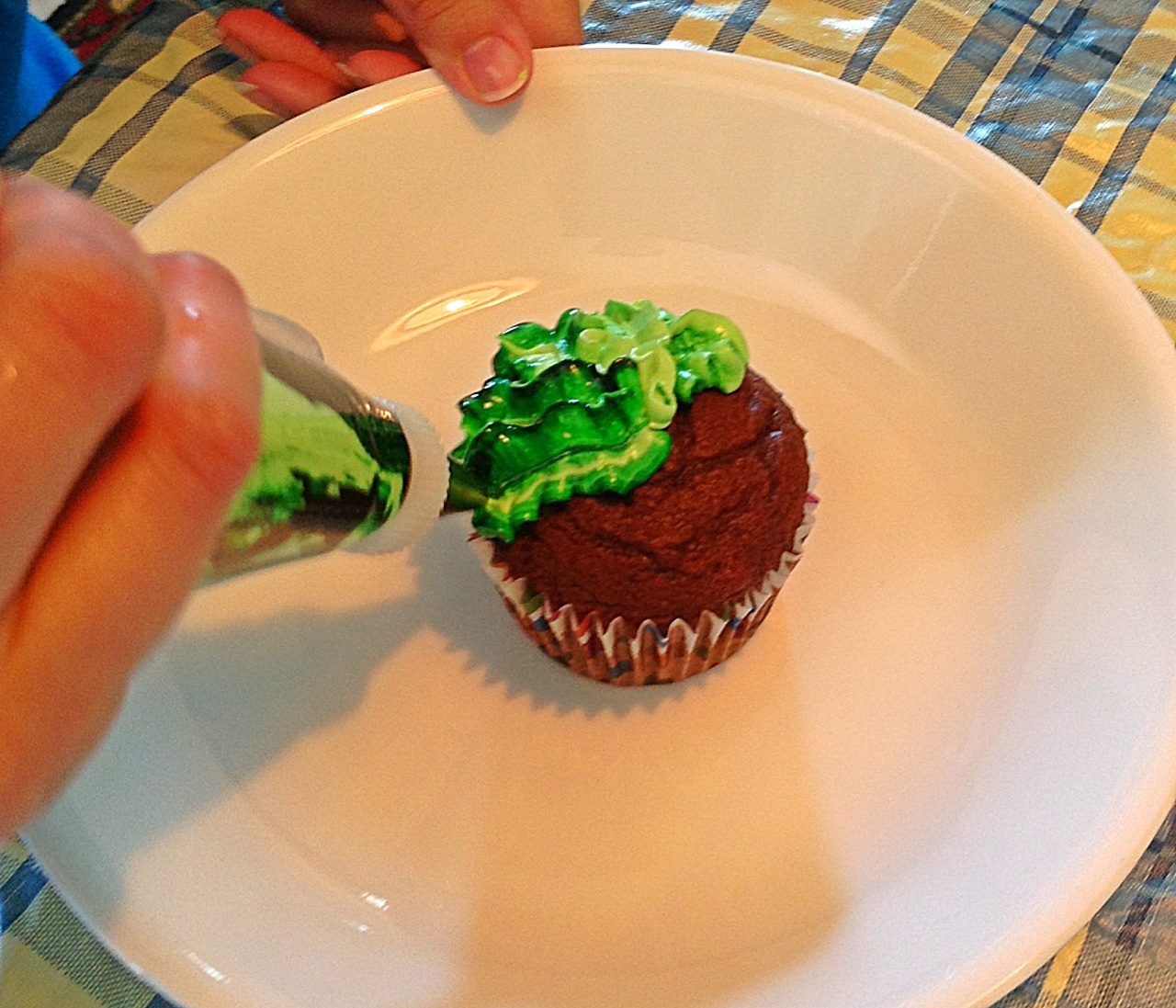 When icing the cupcakes I wanted a leafy looking icing so I could settle a fondant jungle animal on top. To achieve the leaf look I wanted I tinted my icing with bright green gel coloring, and then streaked the inside of my piping bag with a dark green gel coloring. Below are some pictures of this.