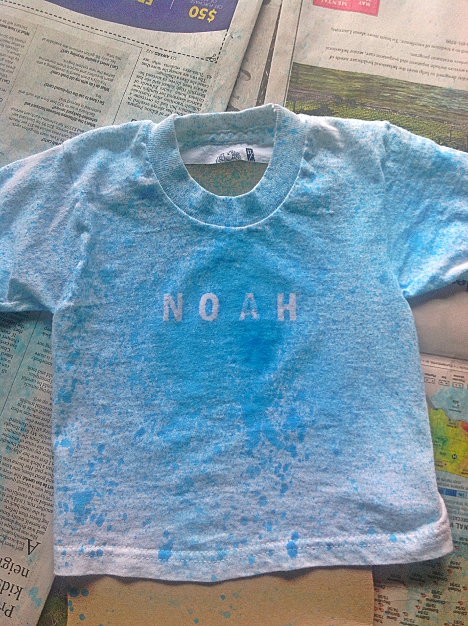 Then I took a small t shirt my son’s size and put scrapbook letter stickers I had on it and spelled his name. I slid the front of a cereal box I cut out into the shirt to keep it from leaking through to the back.