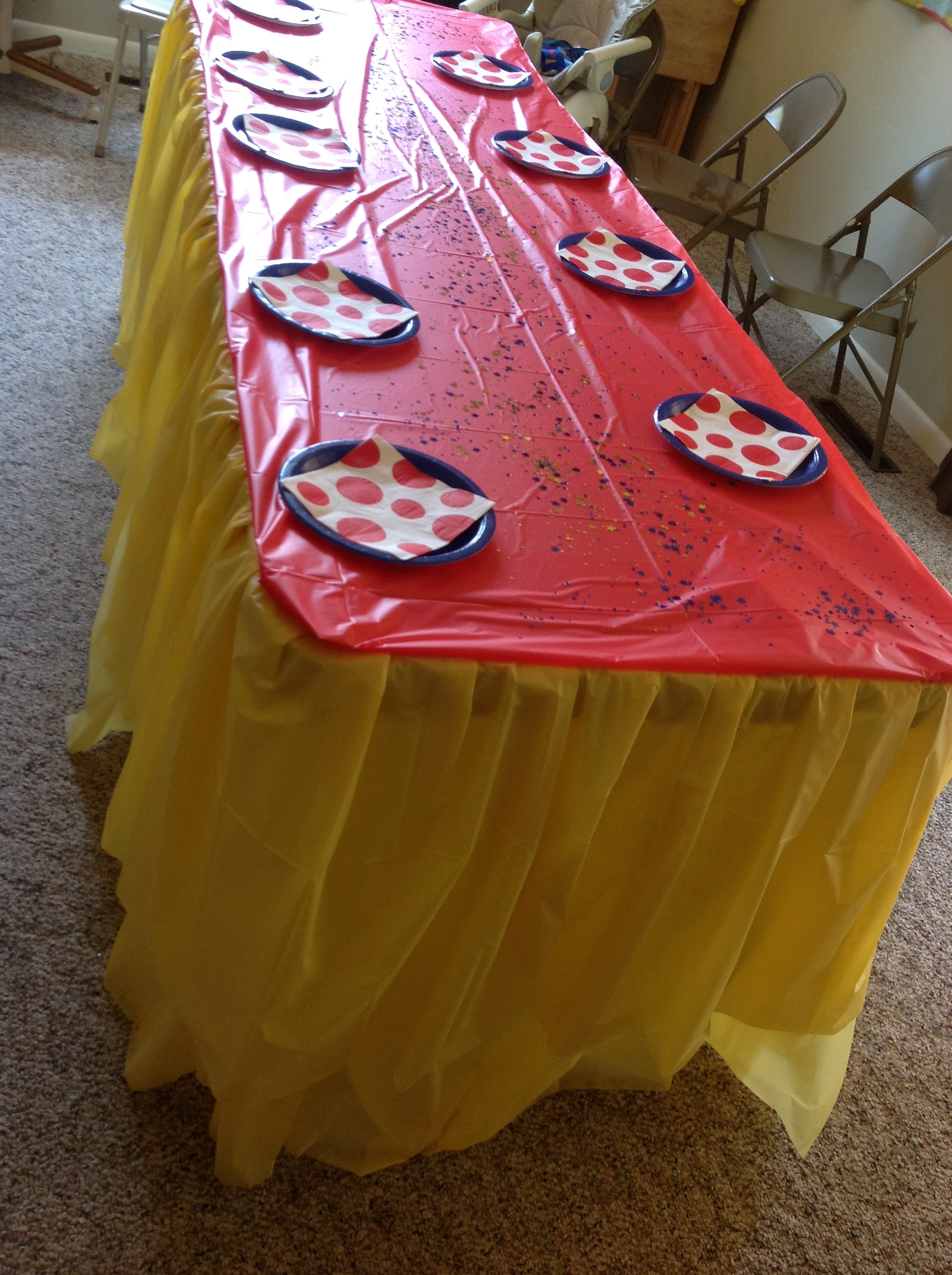I used all four table cloths around the table and then placed a red plastic table cloth folded on top to cover the tape and give it a finished look. It went well with the Mickey Mouse clubhouse theme.