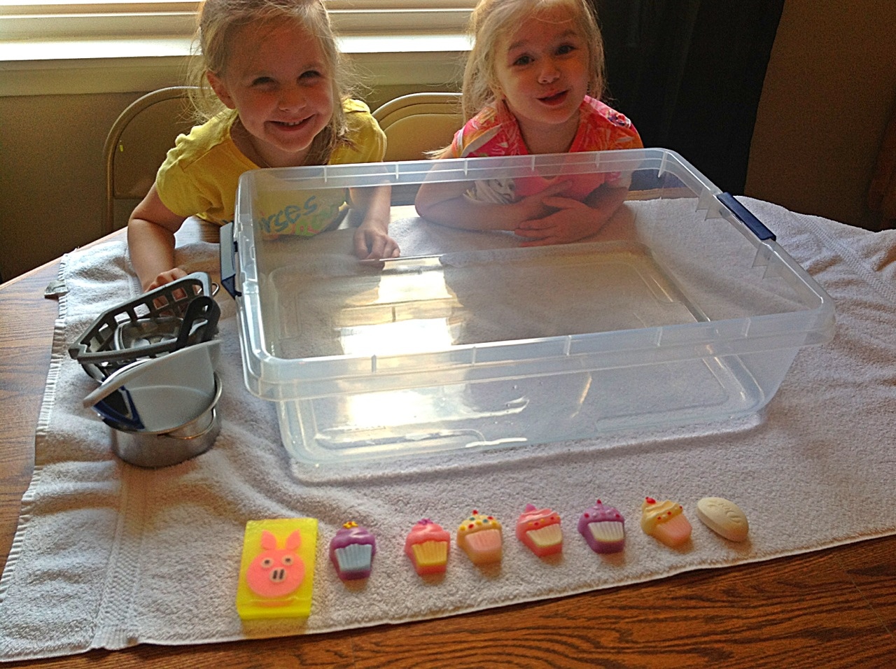 I grabbed some dishes that were dusty and dirty anyway from their play kitchen and filled the sensory table with water. I found some decorative fun soaps we got as gifts they could play with.