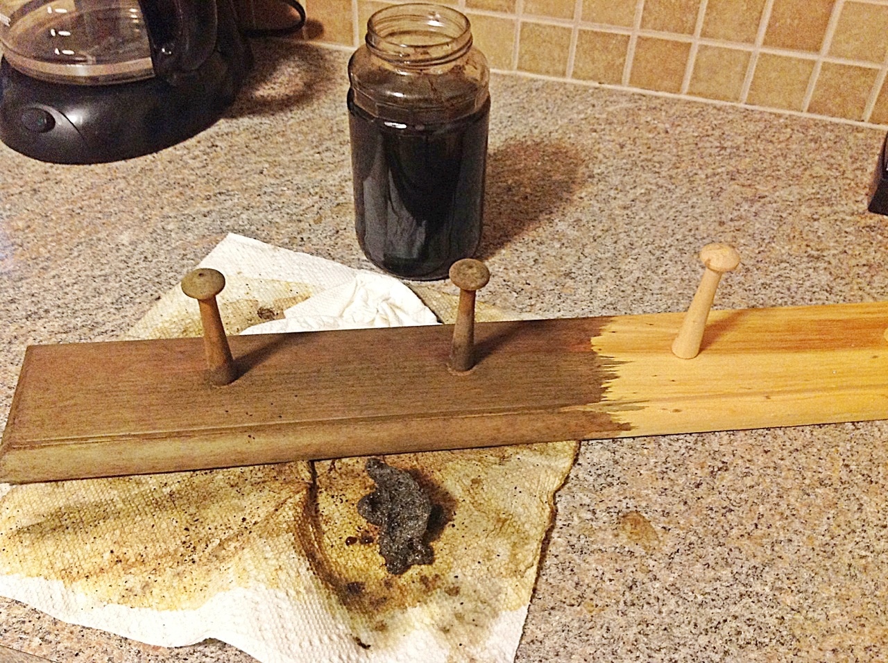 I have wanted to hang pegs in the entry way for a long time also, but have only unfinished ones that have been hanging around for years. I’ve toyed with the idea of painting them or staining for a long time. I just could never commit to a color that would look good with my great bench. I came across an idea recently though, of a natural stain. I tried to track it down to the person who originally had the idea to give them credit on here, but with no luck. So here I am using this method but it’s not my idea, just a great idea I’ve found.