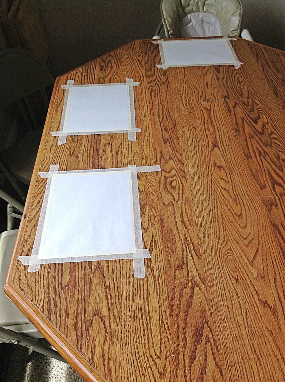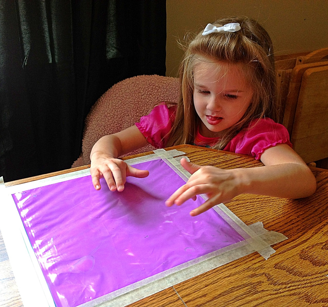 I also taped white pieces of paper at each kid’s place at the table. This was so when they used their fingers to draw in the paint they would see the bright white underneath.