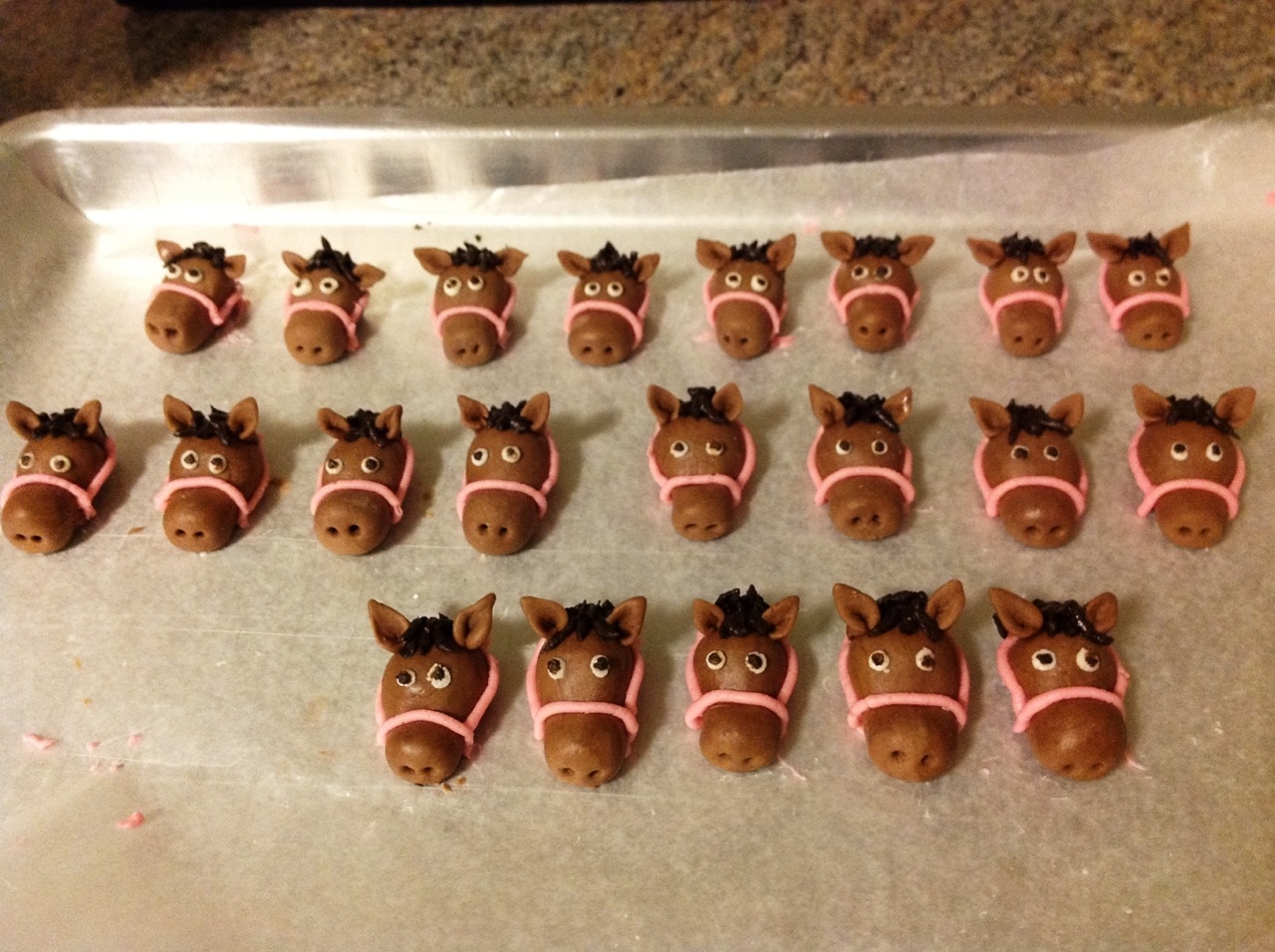 I love that I didn’t have to use a drop of food coloring in the fondant! It saved me thirty minutes of kneading šŸ™‚ Oh and let me tell you, the taste is amazing! Eric thinks it tastes like tootsie rolls, my sister says it tastes better. Here are my horse heads ready to go on some cute pink cupcakes!