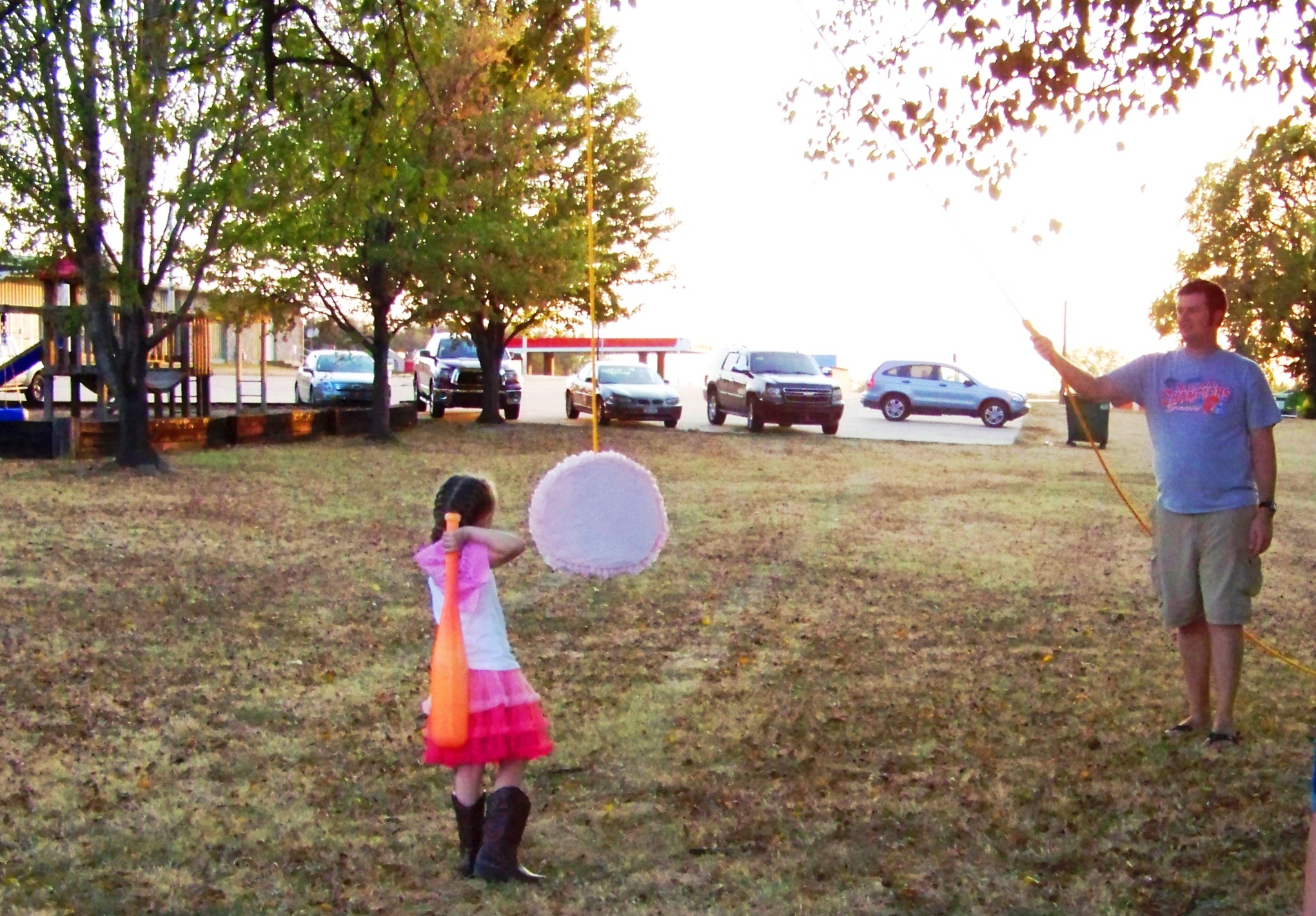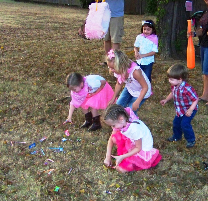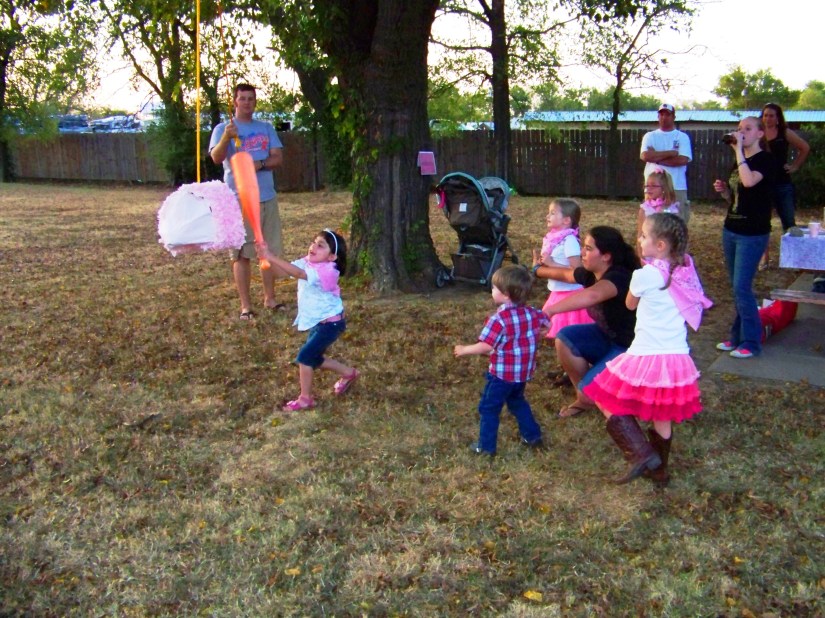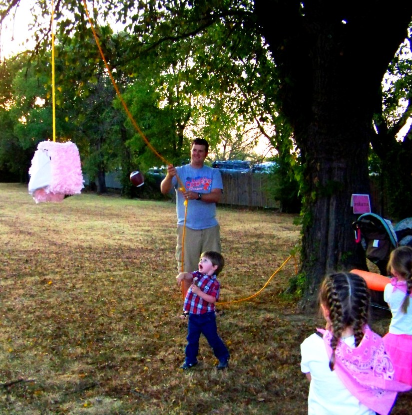 Finally I will show you the games, well most of them. First is the pinata, I tried making our own for the first time ever. This was a bit harder than I thought it would be, but I loved the results and Katie did as well and that is what really matters to me. Eric designed the front of the pinata and we had it printed at the local office supply store, have I said what an awesome hubby he is? I’m crazy thankful for him! I used poster board reinforced with cardboard for the circle and then put the front and back on which consisted of tissue paper and Eric’s design. My sister and I hot glued tissue paper squares around the edge to give a cute ruffle look. The kids loved hitting it open! My son even tried hitting it with a football 🙂
