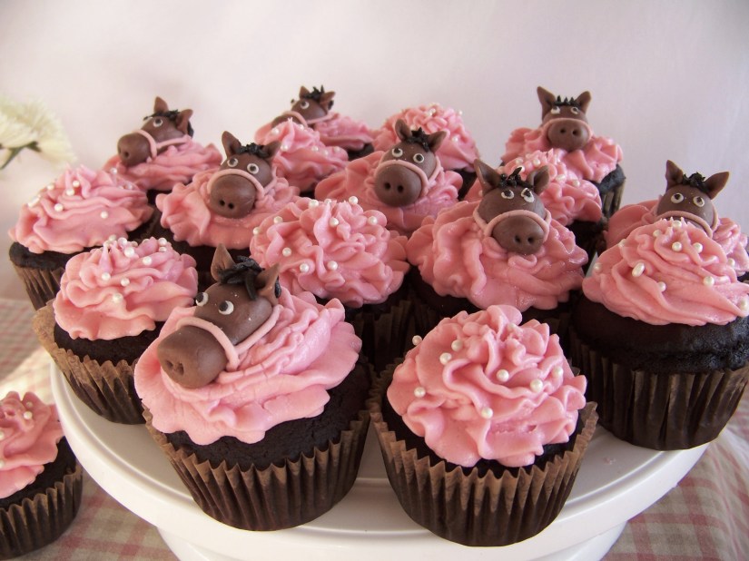 The invitations were put together by her daddy and were adorable, sorry no pic, but big props to my husband on a really amazing invitation! Katie really enjoyed inviting people 🙂  The food was simple finger foods and cupcakes. We made chocolate and light pink cherry icing cupcakes with chocolate fondant horse heads on every other one. Then edible pearls on every other one.