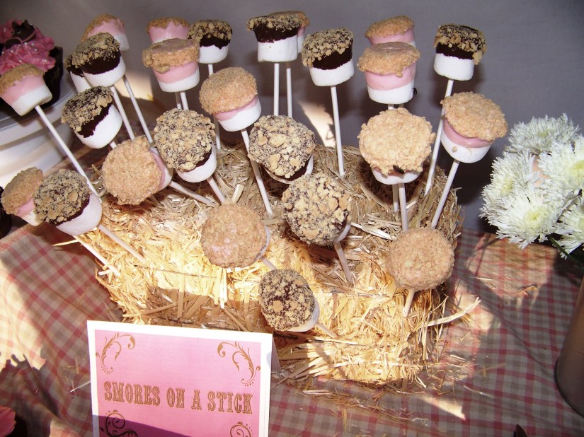 I also made s’mores on a stick, some with melted semisweet chocolate and some with melted white chocolate with light pink food coloring. They are just marshmellows dipped in the melted chocolate and then rolled in graham cracker crumbs. They only took us about 30 minutes to make and were a big hit! I stuck the sticks in a small hay bale I got at hobby lobby for 2.99, I loved the look of them on the food table.