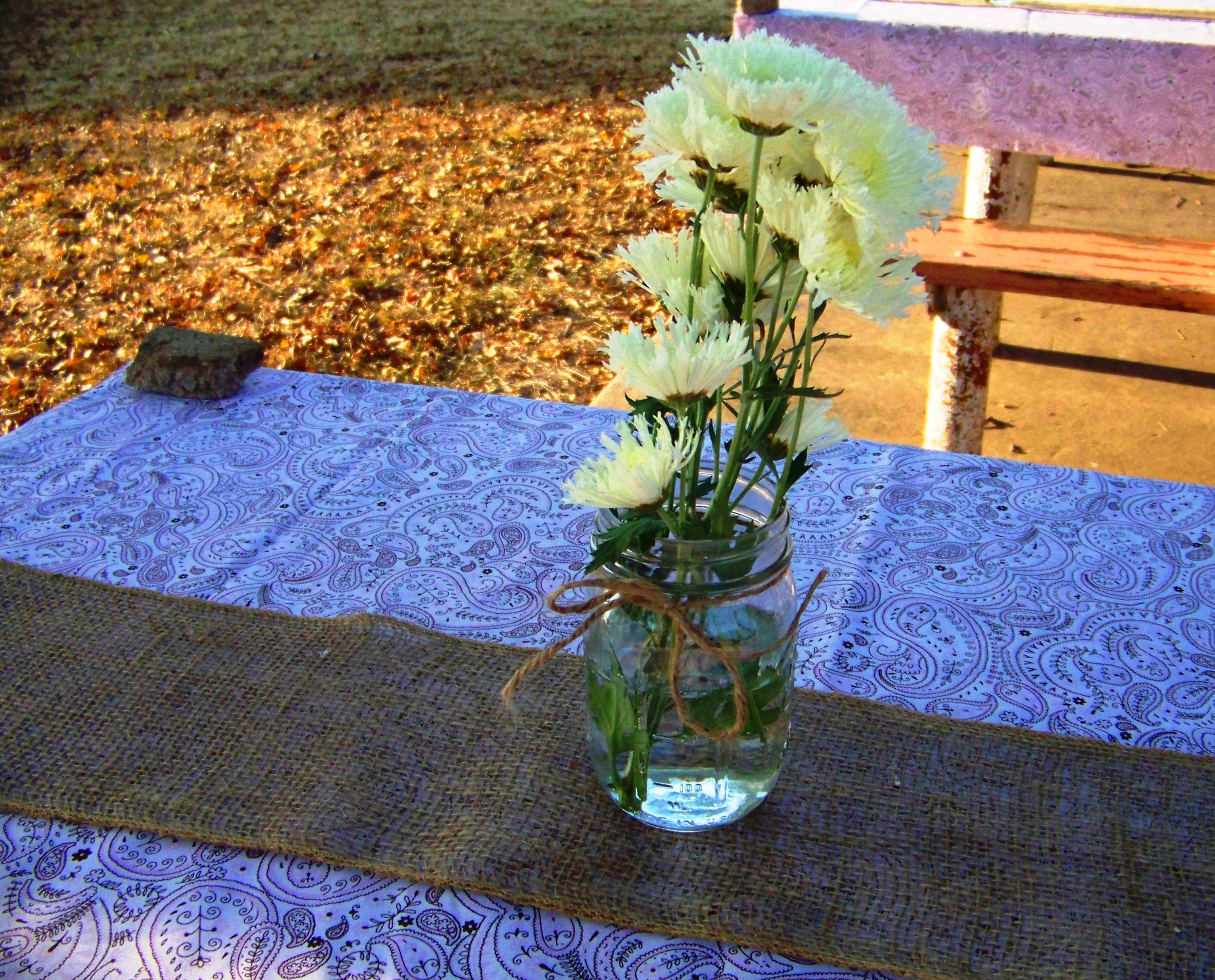 Now I will move on to the decor side of what we did. We used some pretty white, pink and brown paisly fabric I found at hobby lobby on sale for the table cloths. Then I used some burlap I found $2.80 for 30  ft. as a runner down the middle of the tables. I used my ball canning jars as small vases, 3 per table with some gardening twine we had tied around each in a simple bow. Then we put a few “shabby chic” style white flowers we got in bulk for 3 dollars in each to finish the tables.