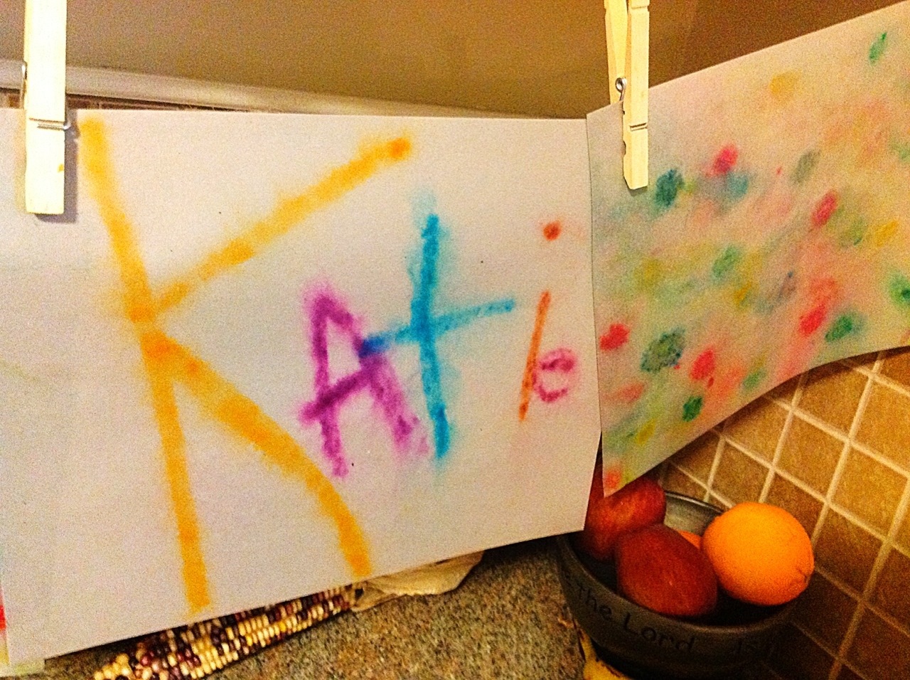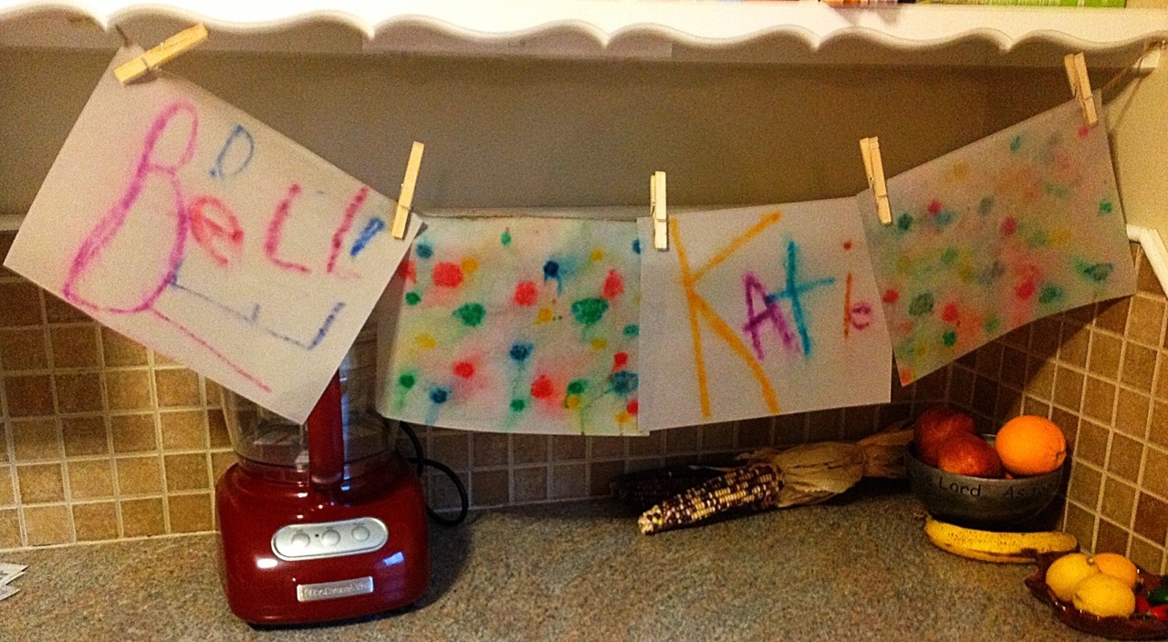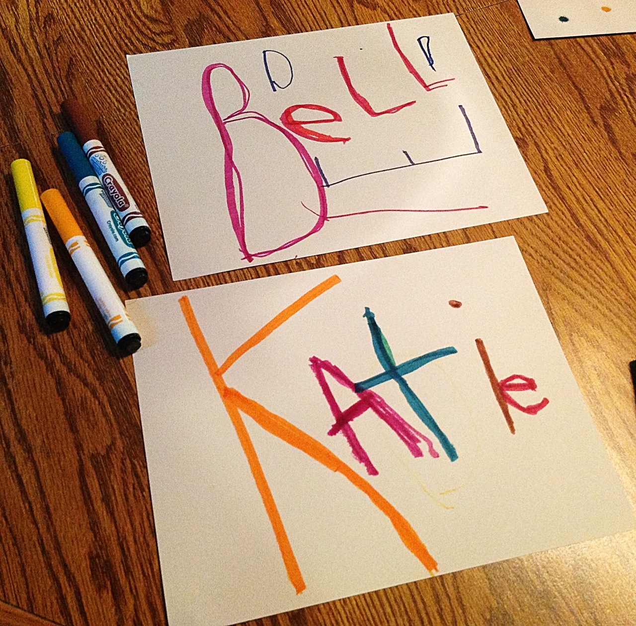 First I got out some card stock and washable markers and asked the girls to write their names really big with lots of color!
