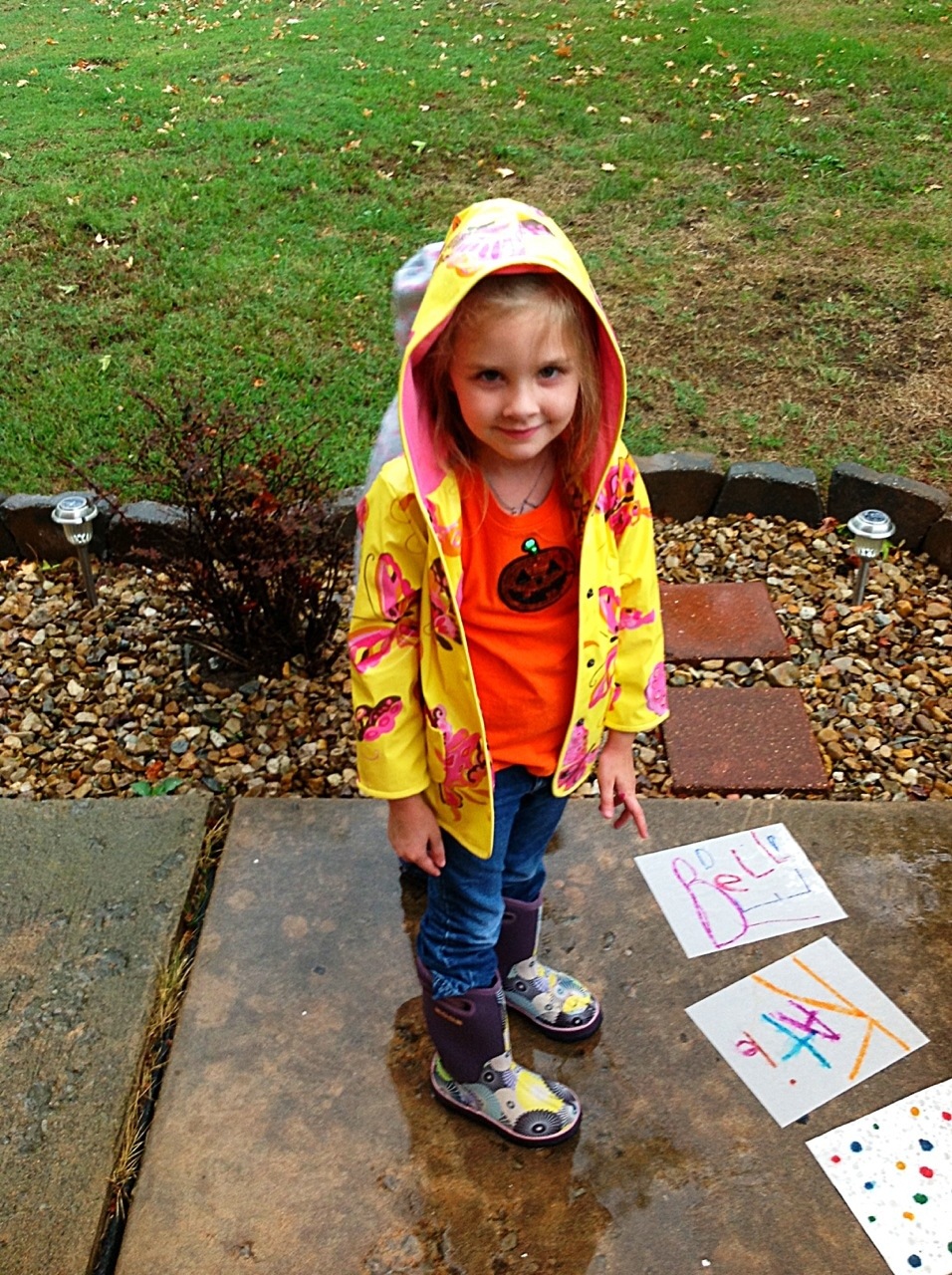 Then outside into the sprinkling rain we went 🙂 and laid the papers on the front sidewalk.