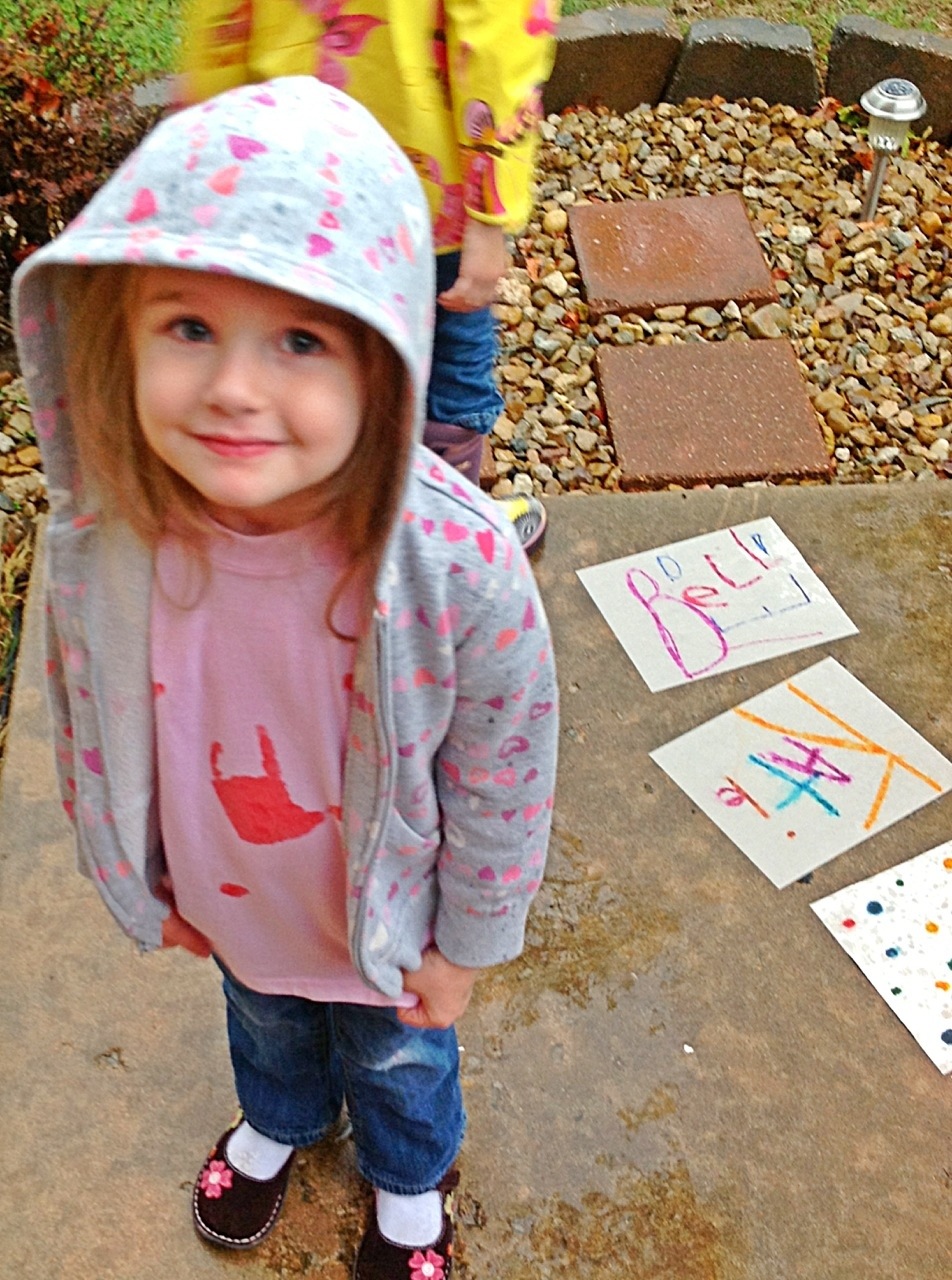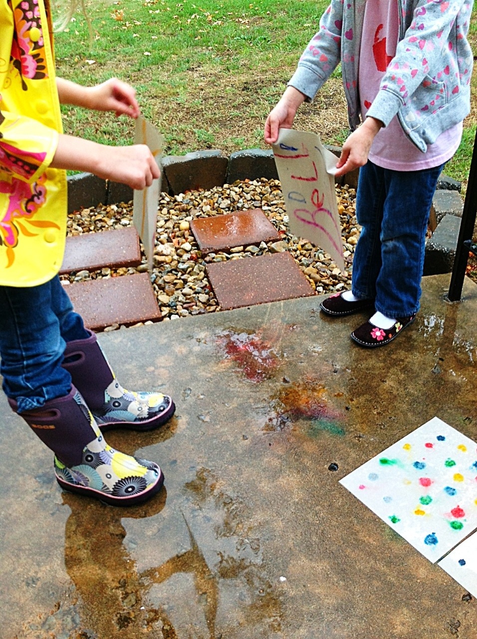 Then we waited and watched as the colors leaked and spread. When we picked up the papers the girls loved the colors on the side walk!