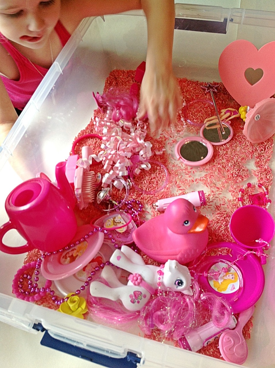 Recently the girls and I had a princess pink afternoon full of reading princess books, dressing up in all pink, eating pink snacks and pink sensory play!