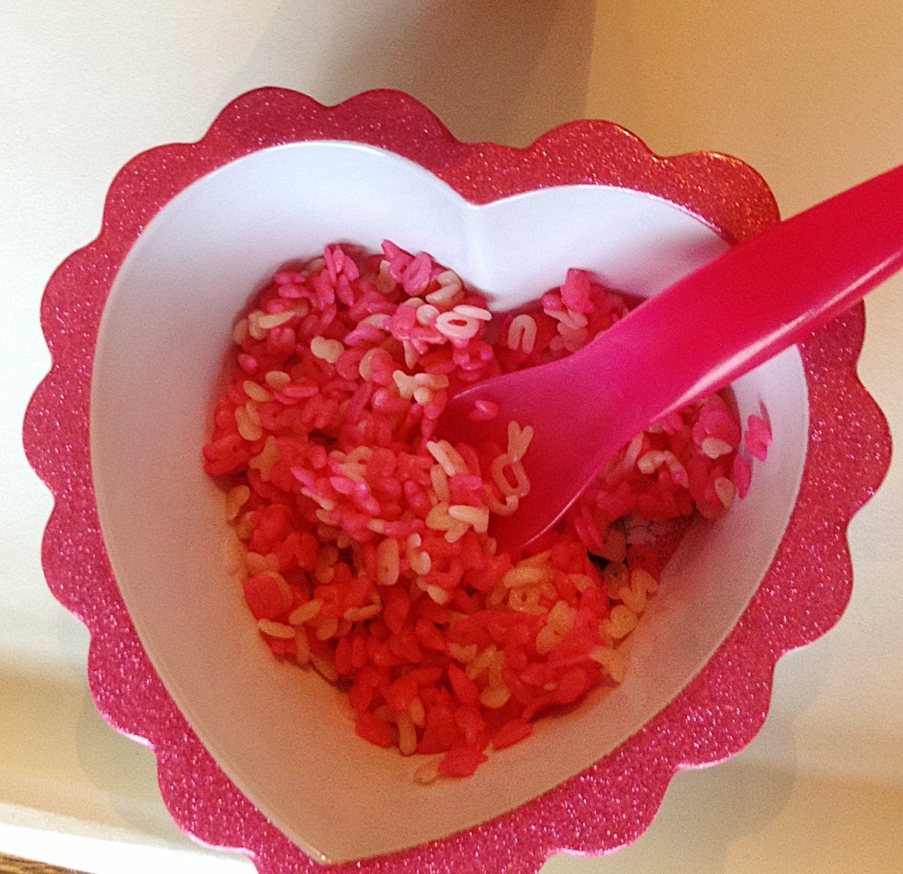 I let the girls help me make pink rice by just stirring a bag of rice with pink food coloring until it was all pink. We let it dry during nap time and then I put it in their sensory table with some pink toys I found in their room (I almost never buy anything for sensory play, I use what we have).