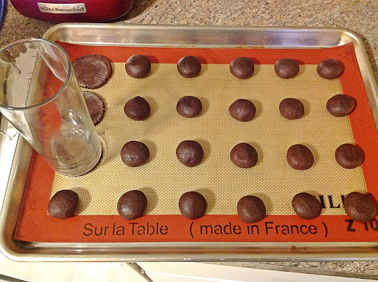 Next use a glass with a smooth bottom dipped in flour to press the balls flat.