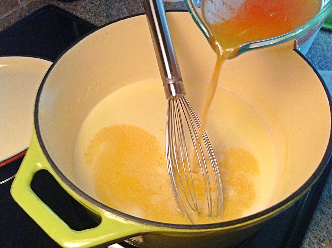 Next add the cream and milk slowly while whisking the rue into the liquid. Let this cook on medium to low heat for about 15-20 minutes while stirring. Then add in the chicken stock, again while stirring.