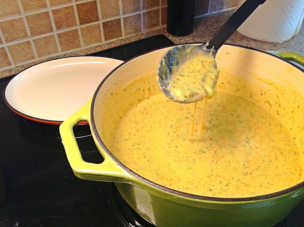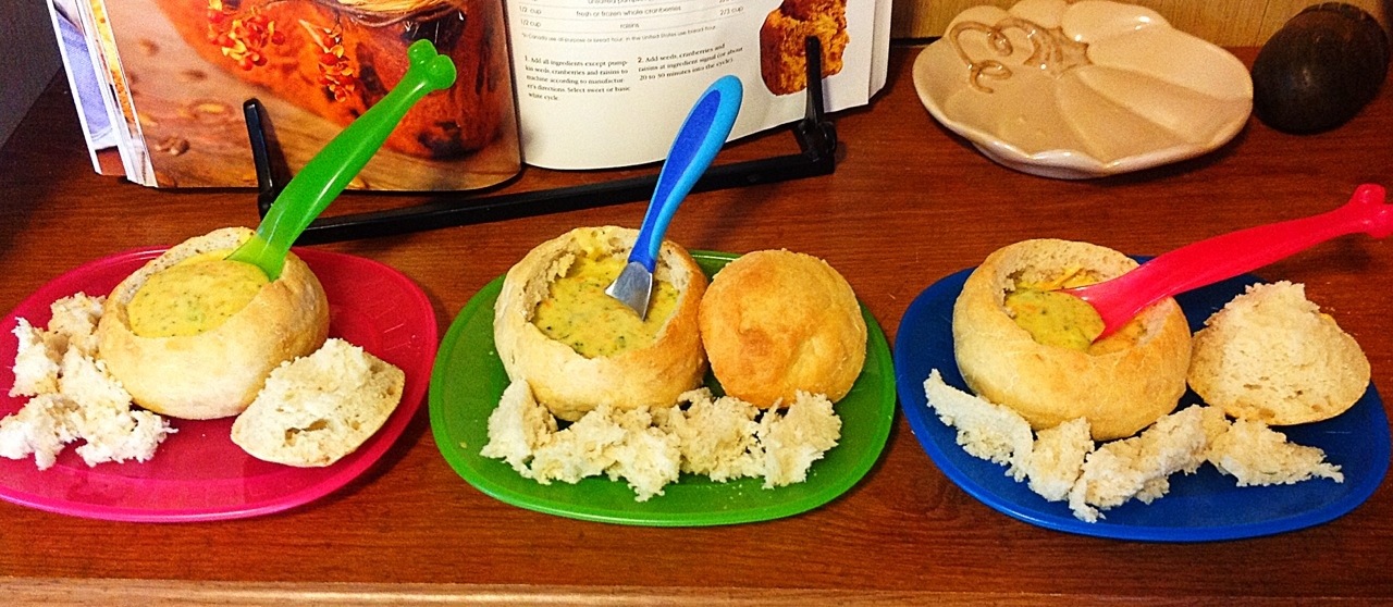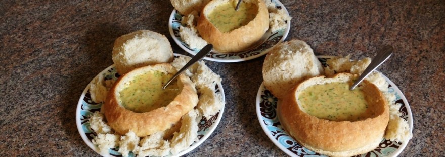 Now that fall is here I have been craving some yummy soup! One of my very favorites is broccoli cheese. Only made better by being served inside a fresh bread bowl with chunks of bread from the inside sitting around the plate to dip in my cheesy soup.