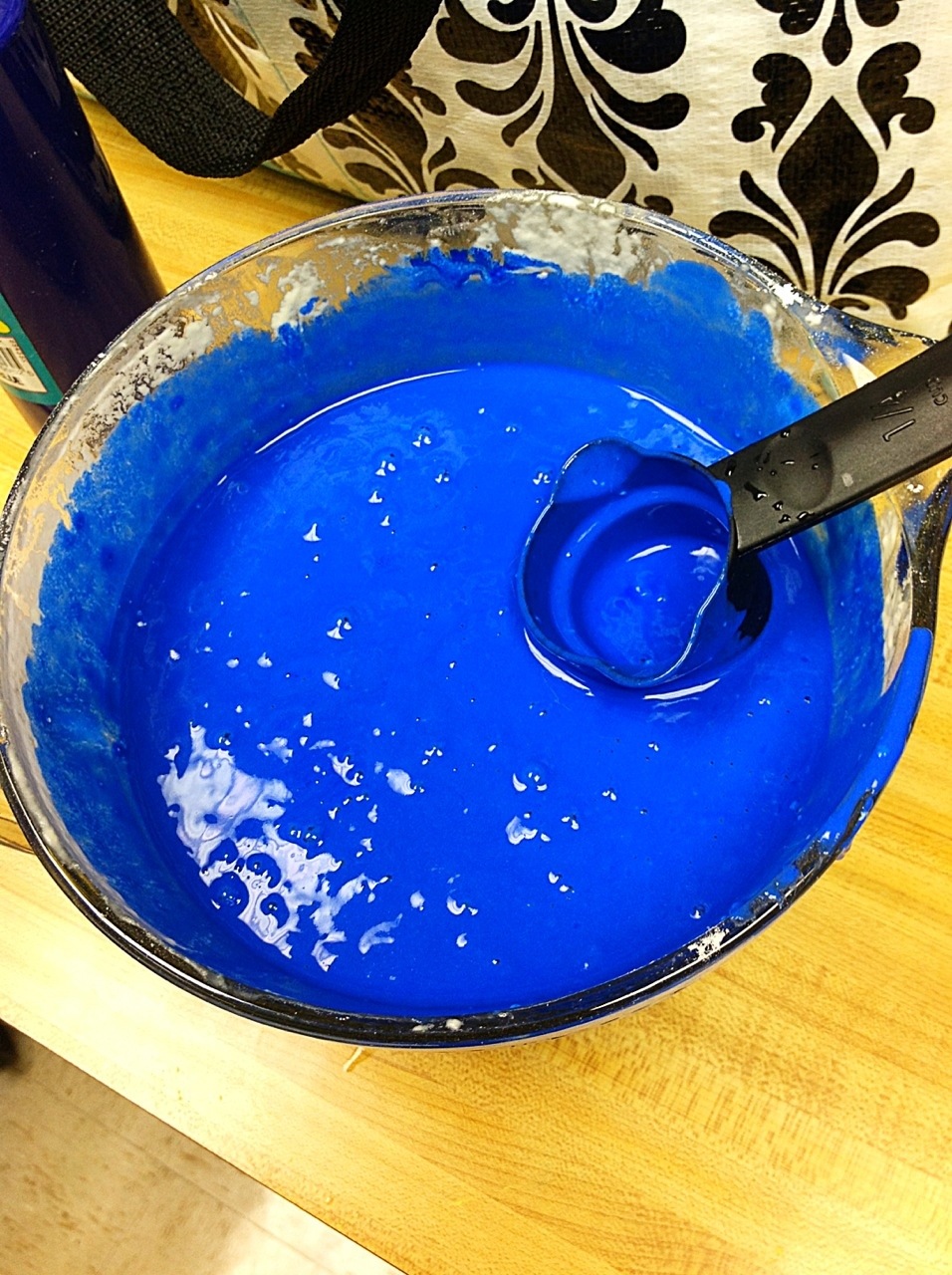 I used a quadruple batch because I can have up to 16 kids sometimes. I did two of these big batches one for yellow and one for blue. The yellow I added some clear glow paint to so the kid’s moon and stars would glow.