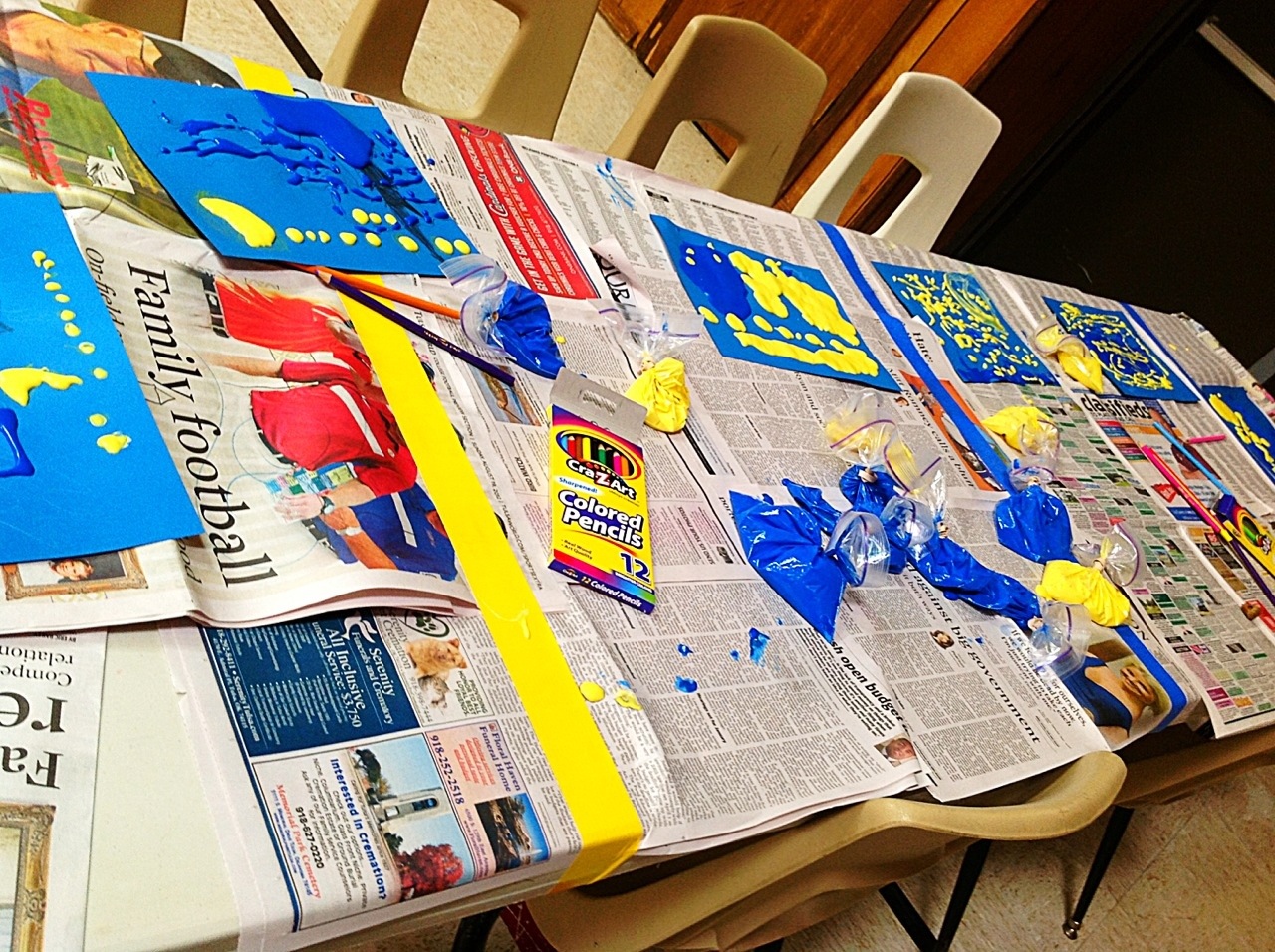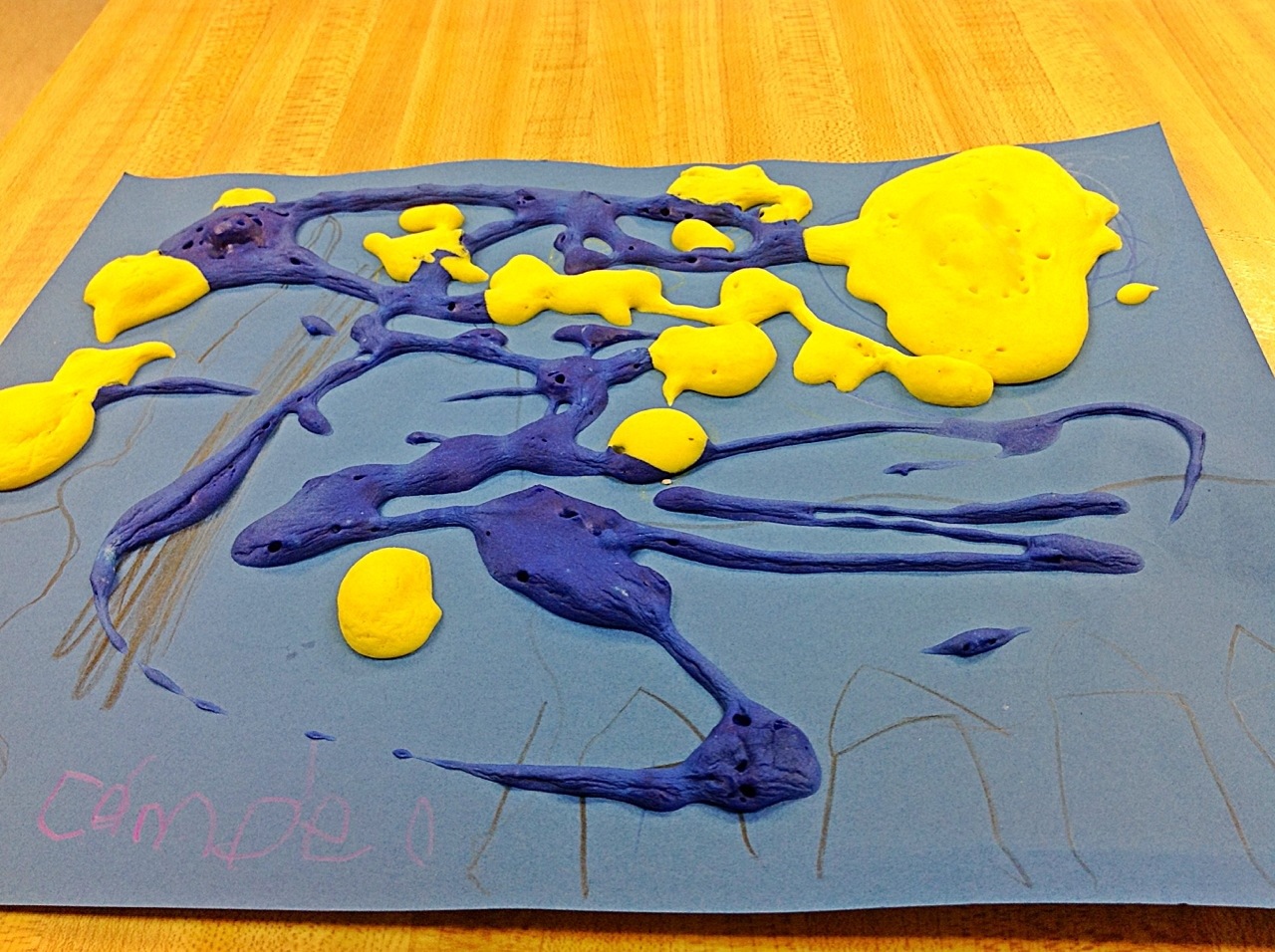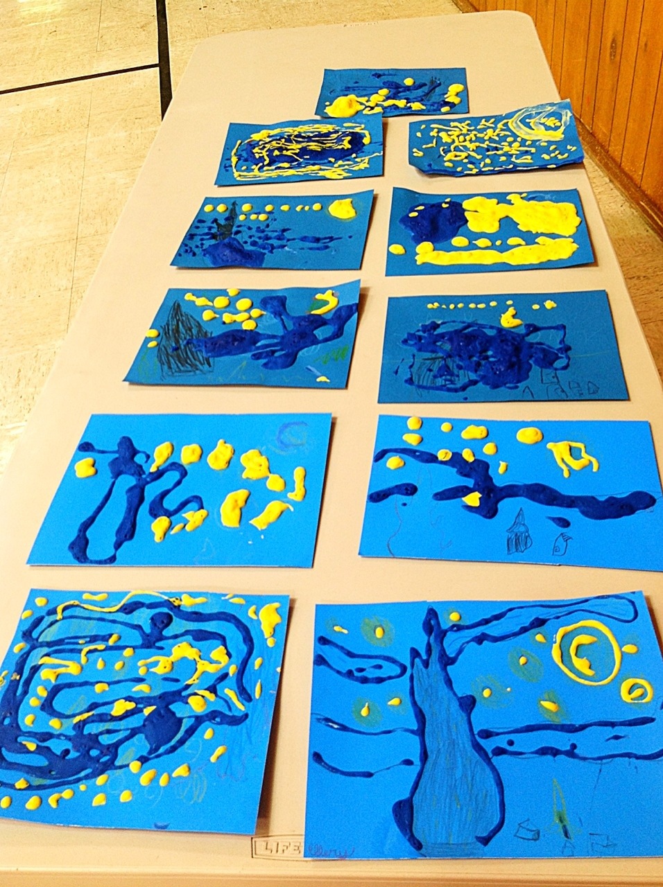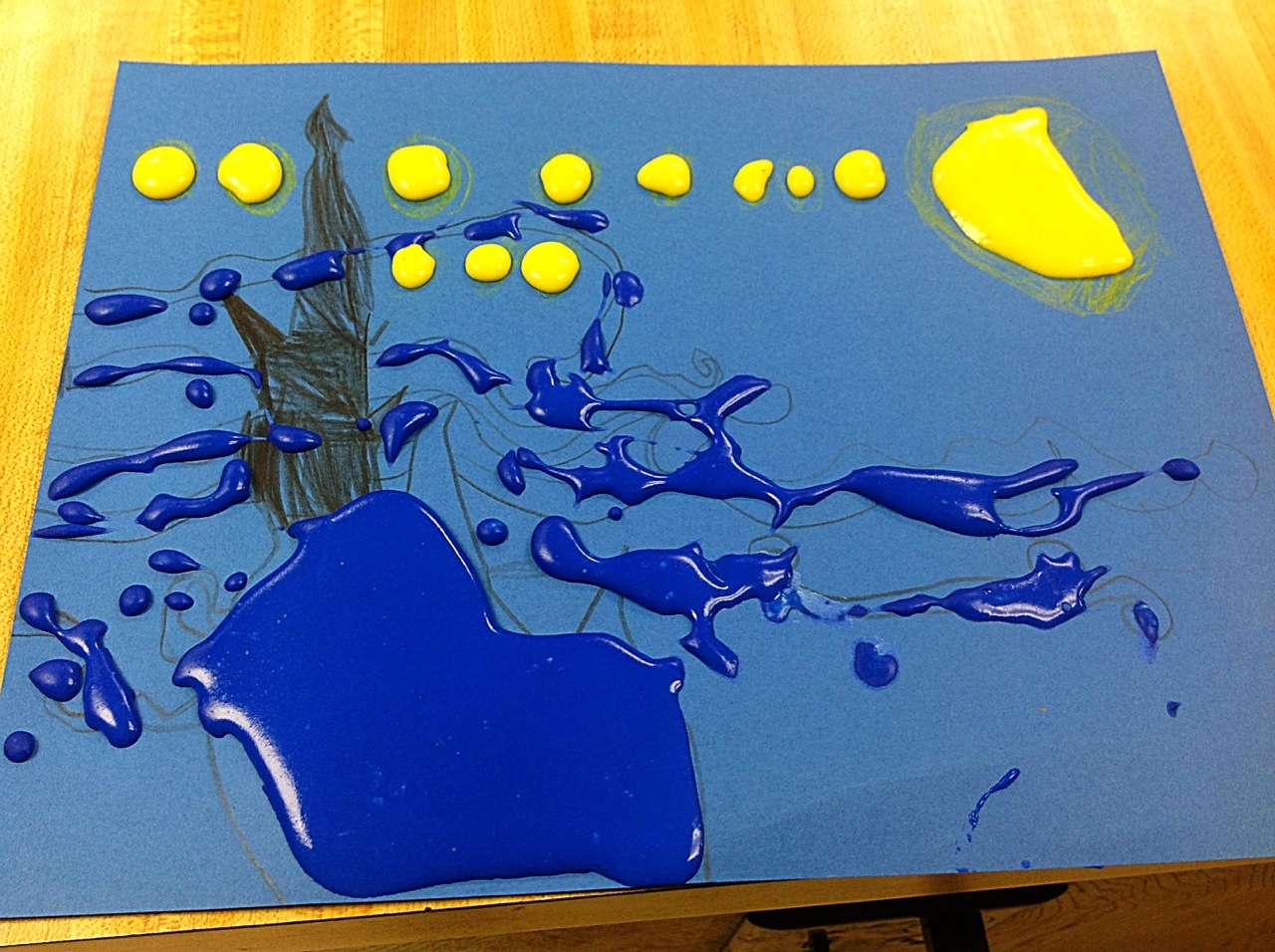 First I let the kids draw their version of Starry Night on their piece of blue paper and then they used the blue and yellow puffy paint for texture.