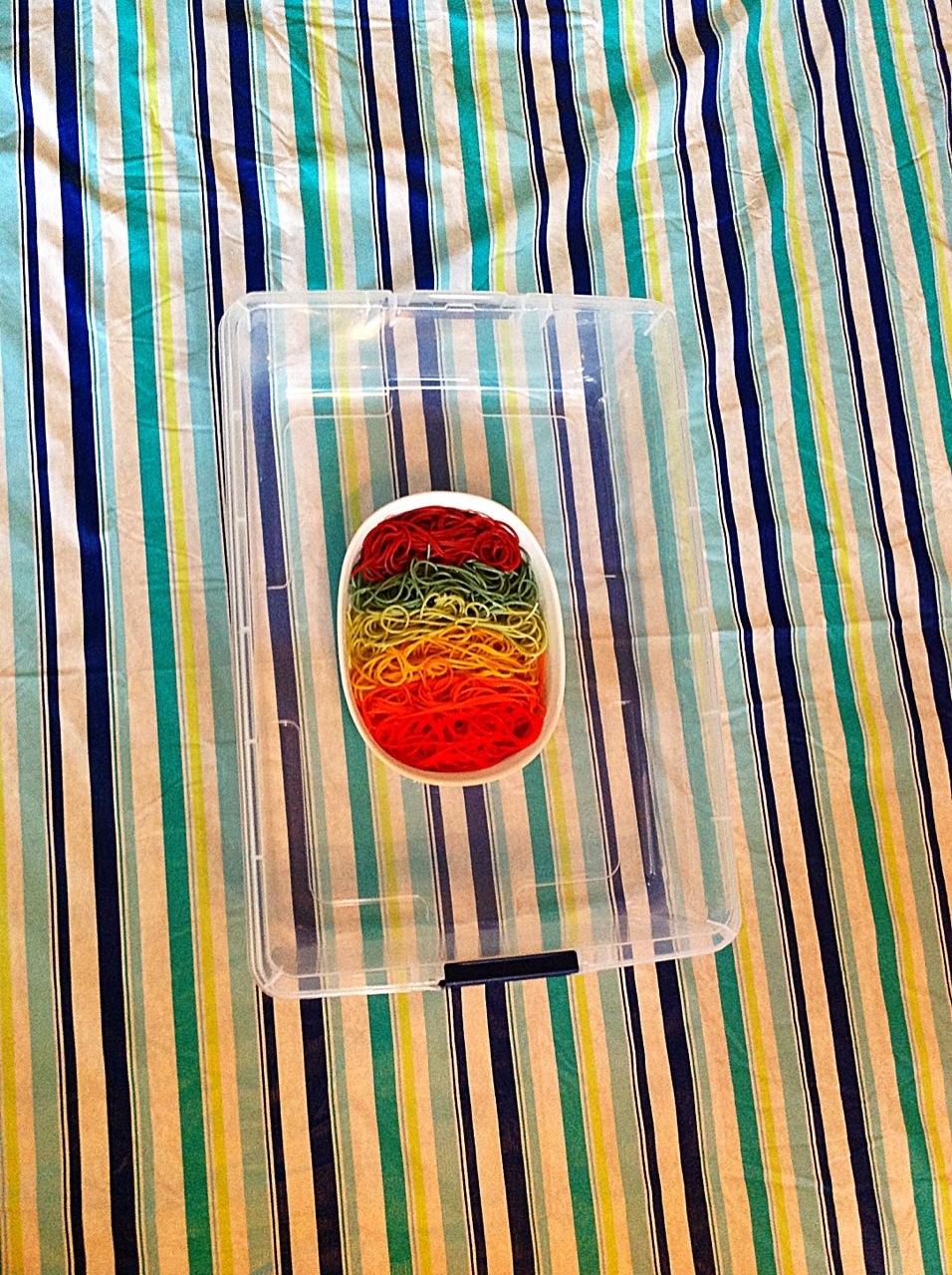 This made for a squishy and bright activity with many giggles and squeals! A few tips on the pasta, I boiled while trying not to waste food coloring when possible. For instance I boiled the red right before the purple so I could remove the red pasta and just reuse the red water and add some blue for purple. Also yellow and orange same thing, I added red to the yellow water. Also I sprayed just a bit of olive oil on the pasta when it was drained so the noodles wouldn’t stick to each other and the kids as much and play would be more slippery fun.