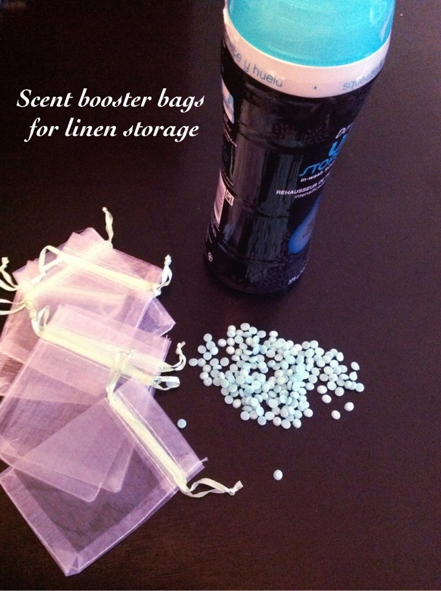 1. Great idea! My hall linen closet does the same thing. I’ve tried baking soda and some other things but it just doesn’t do the trick. Question: What brand of scent booster do you use? I don’t know that I’ve used one that come in little beads…Thx!