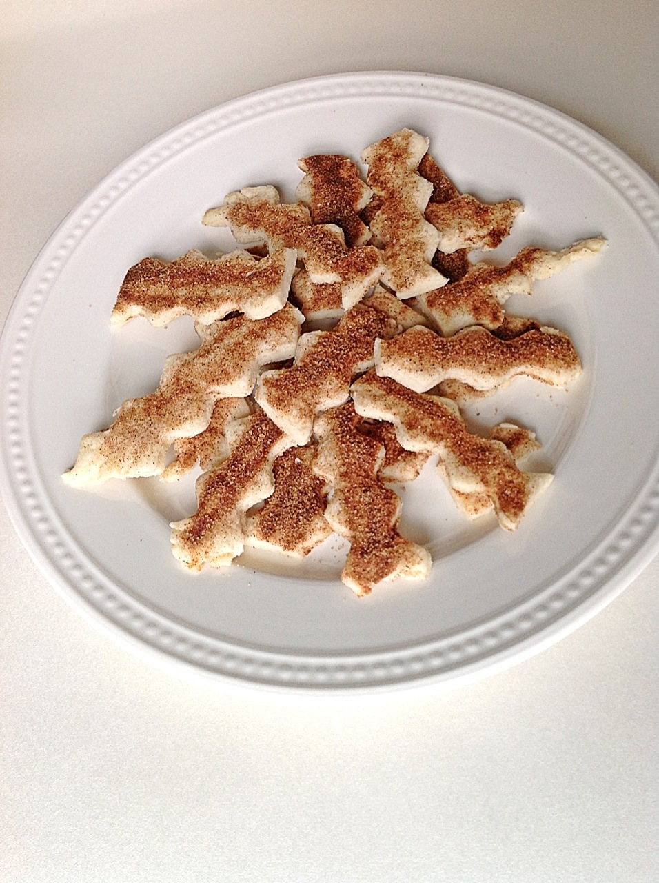 Then I use a fork to prick them and sprinkle with cinnamon sugar. I bake them at 350 degrees until barely browned and then let them cool.