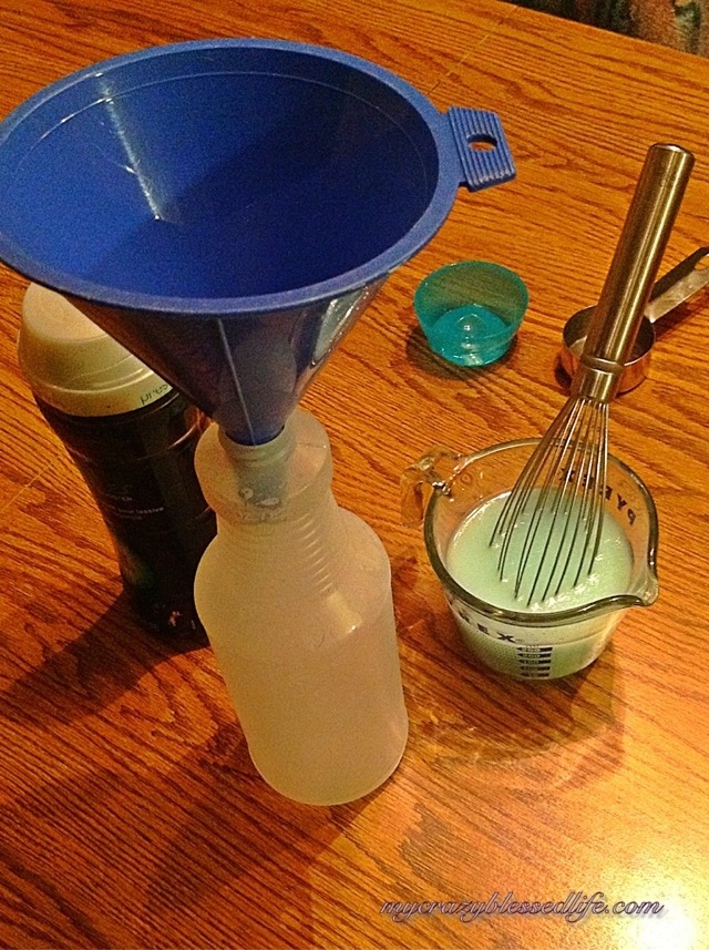 I put 1/4 cup of the scent booster into the cup of hot water and stirred until melted. I poured the mixture into my spray bottle with a funnel and then filled the rest of the way with water. My spray bottle is 28 ounces.