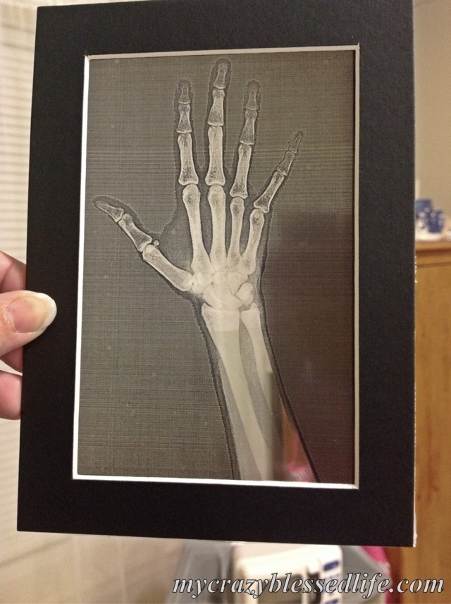 First I found a picture of an X-ray online and then printed it off in a 5×7 size. Next I used a copier to copy the image onto a piece of transparency paper. Then I bought two 5×7 frame mats in black. I hot glued them onto the transparency, framing the X-ray. I trimmed up the edges and was done.