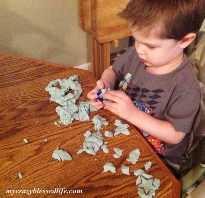 OK, so maybe Eric and I played with this a little before letting the kids have it…. :). Seriously fun sensory experience! I love how soft my hands felt afterwards also, and the smell was so good from the conditioner! Small disclaimer, do NOT let small ones play with this unattended. It is not edible dough, obviously due to the conditioner. I know my two year old loves to put things in his mouth. So I stayed within arms distance of him watching a he played in case he attempted to taste this soft dough I could stop him. My kids loved it, cloud dough and cookie cutters kept their attention for an HOUR! Yay for fun play!
