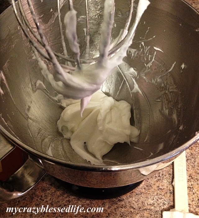 It was so simple! I just put about 2/3 cup coconut oil and 1 Tablespoon of vitamin E oil in my stand mixer. I also added 5 drops each of Young Living Frankensense and Lavender essential oils. I put the whisk attachment on and beat it for about 8 minutes stopping every few minutes to scrape down the sides of the bowl. Soon it looked like this: