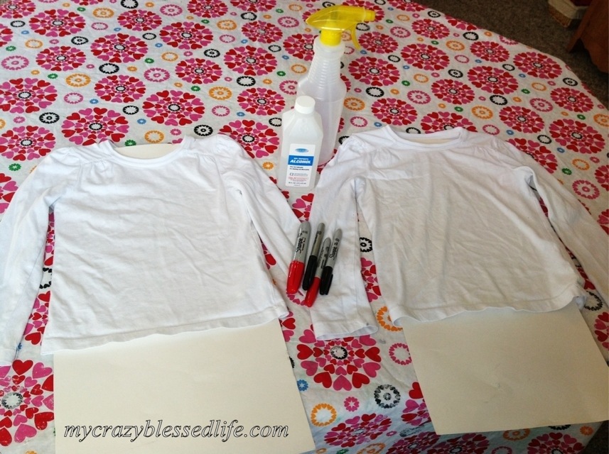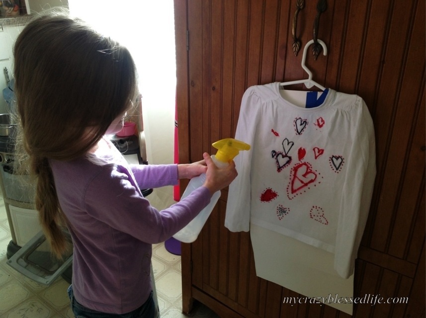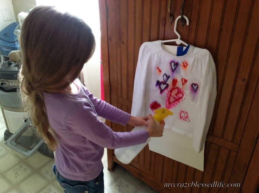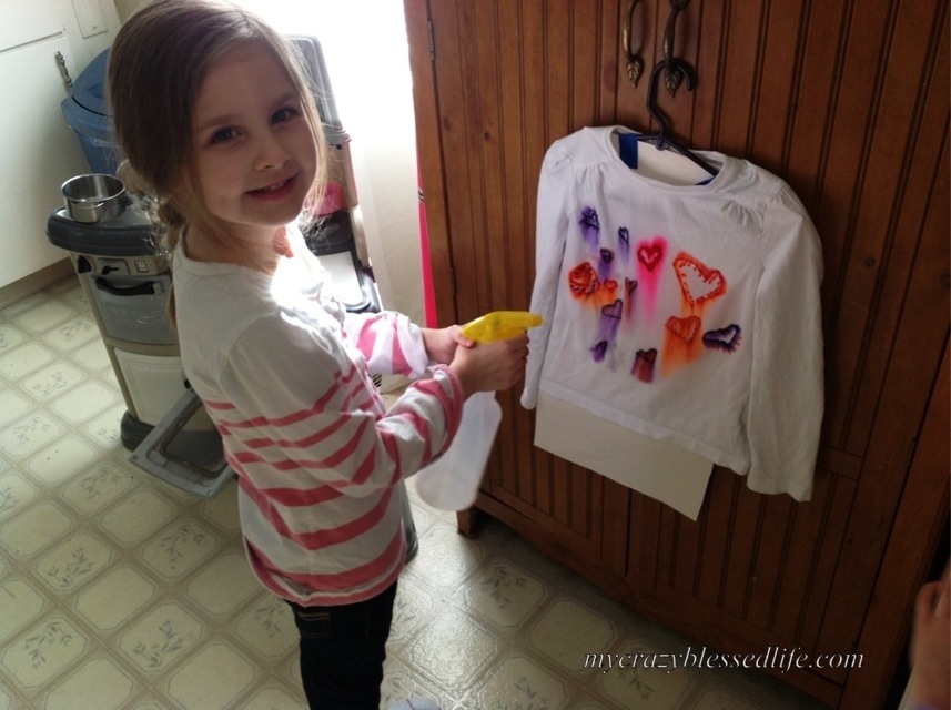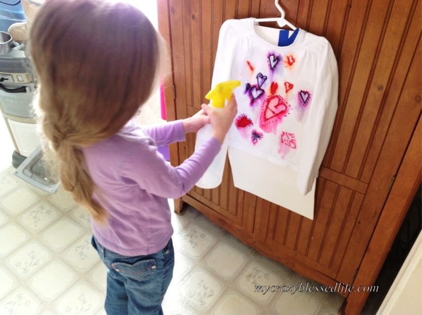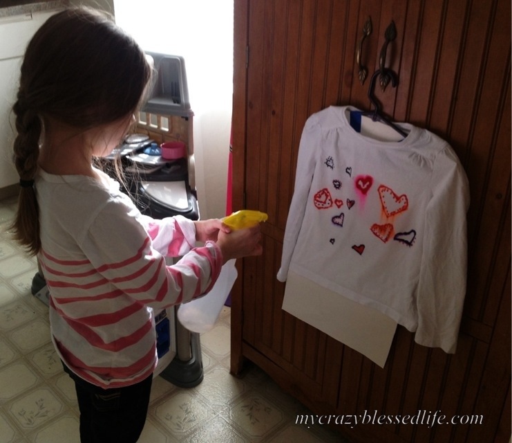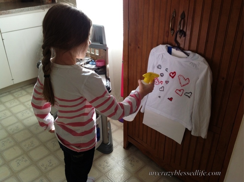 Then I taped the poster board to a hanger and hung the shirts on our pantry door so the kids could spray them with the rubbing alcohol.