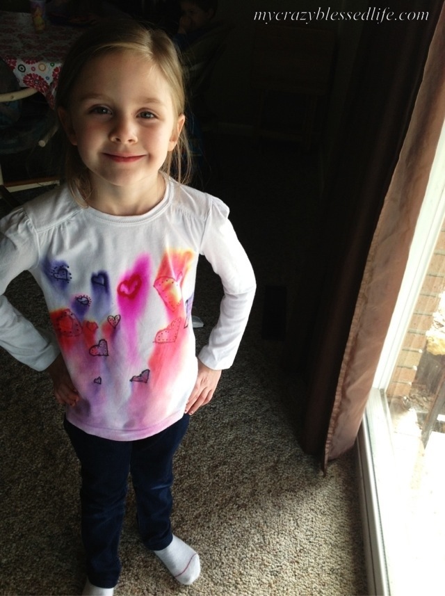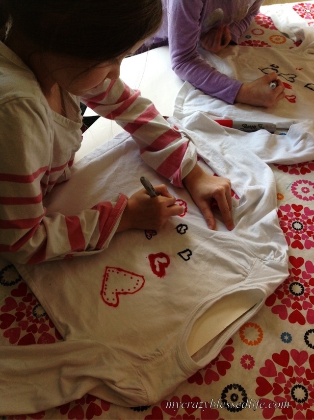 The girls were so proud of designing their own shirts and it was a perfect craft for my 4 and 5 year olds to do today! Here they are modeling them 🙂