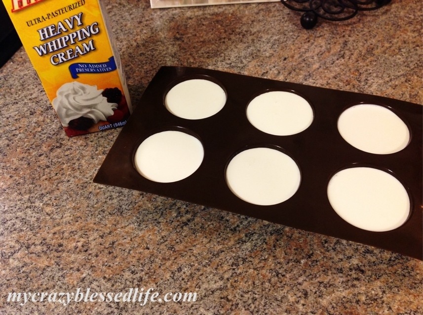 One item I knew we wouldn’t use up before we leave is the leftover heavy whipping cream I got for making Rainbow Snow Cream the other day with my kids. So I measured it out into 1/3 cup increments. I put it into a silicone muffin pan.
