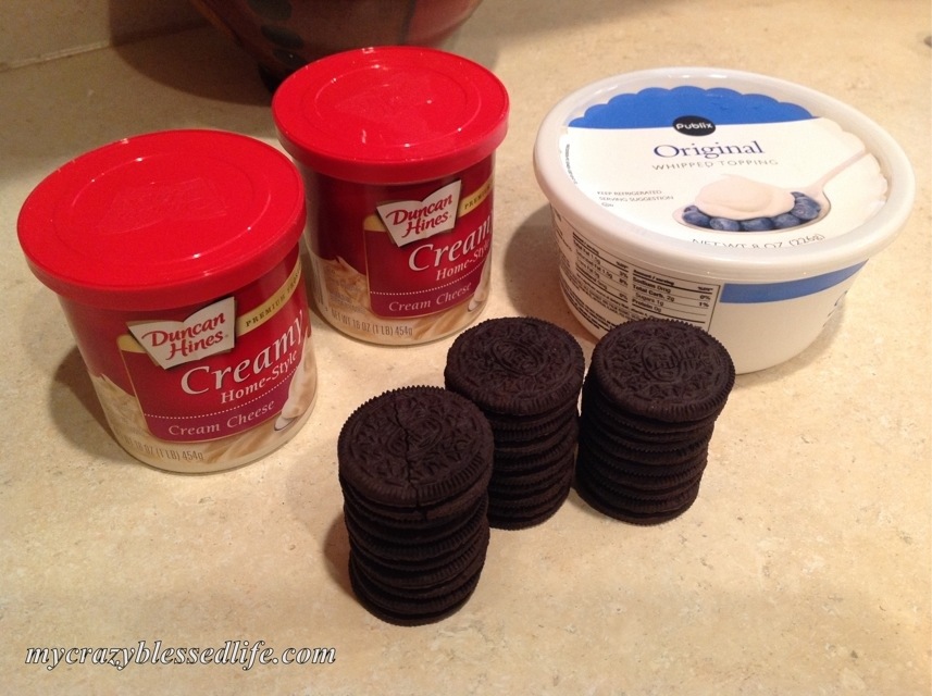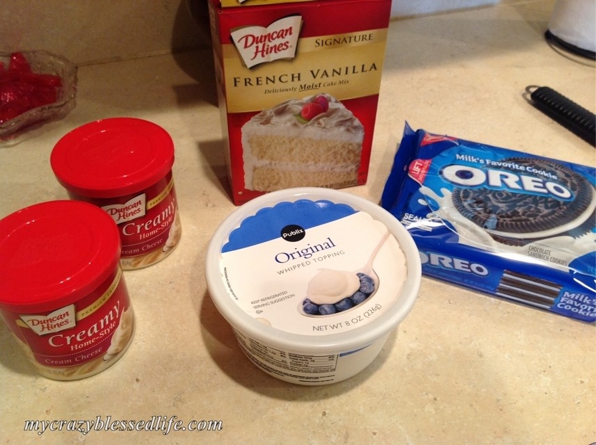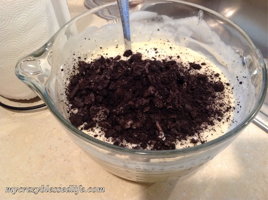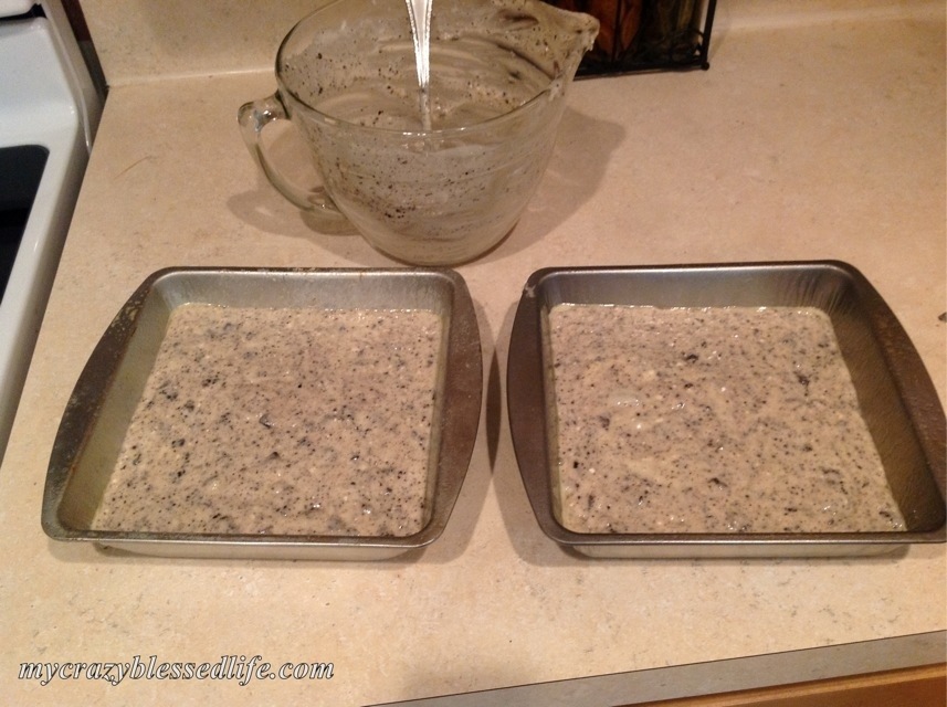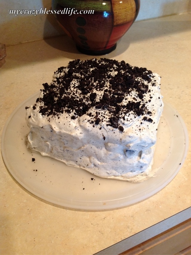 I found a recipe for an Oreo cookie cake on Pinterest that looked amazing! I started reading the recipe because I showed it to my mother-in-law and she said I should make it. She is watching my kiddos tonight so my boyfriend (husband) and I can go out on a date. So I decided it was the perfect chance to make it as a thank you. I changed the recipe some to make it easier to make. A here it is changed and just as tasty 🙂