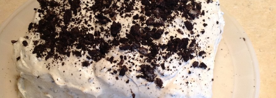 The original recipe can be found here: original Oreo cake recipe. Here is my version, the main difference is I didn’t make cream cheese icing from scratch and then add Oreos and whipped topping to the icing…