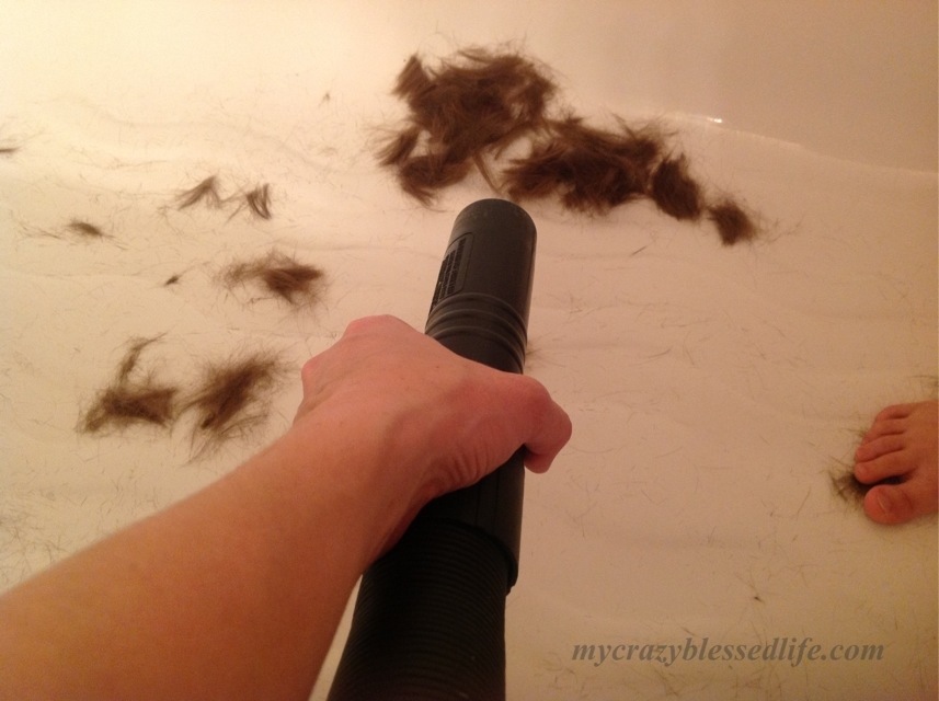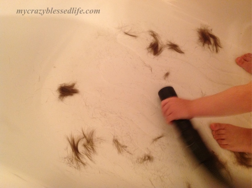 Well after many attempts over his two years of hair cuts we have done many things to try and make the process less painful. Here is what works for my son and I best, especially when daddy isn’t home to help hold him. The tub. Yep, that’s my big secret. I put him in the tub, trim his hair in there, vacuum it up and then rinse and bathe him all in one spot!