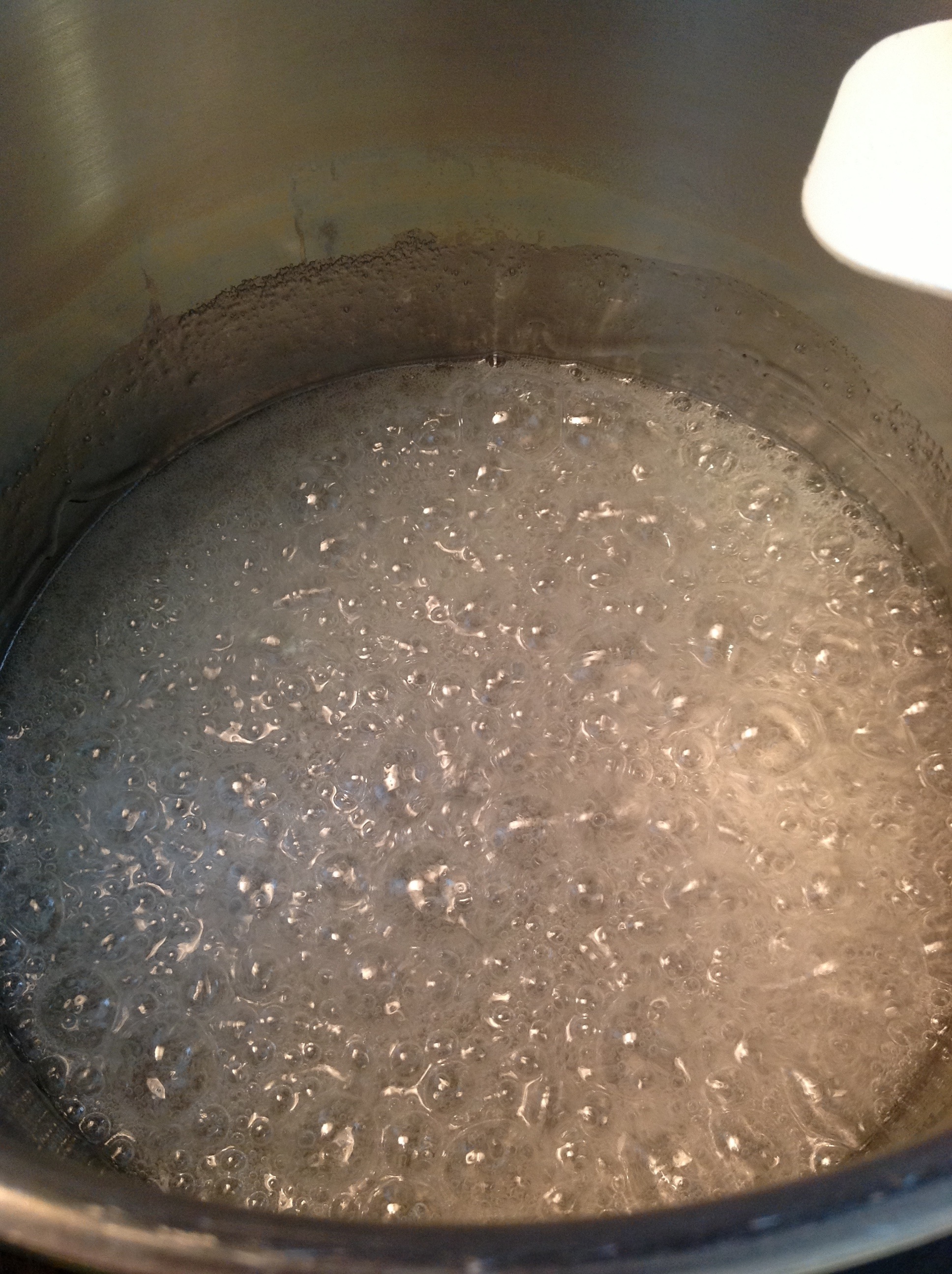 This is an easy recipe and quick to make. First put the sugar and corn syrup in a large pot (I use my big stock pot). When measuring the corn syrup spray the measuring cup first so the corn syrup just slides right out! Put the pot over medium to medium high heat and stir.