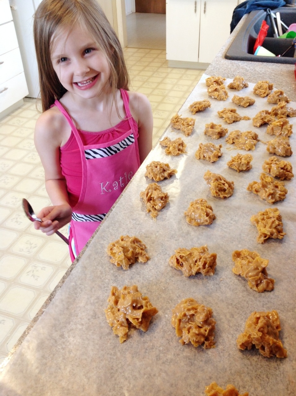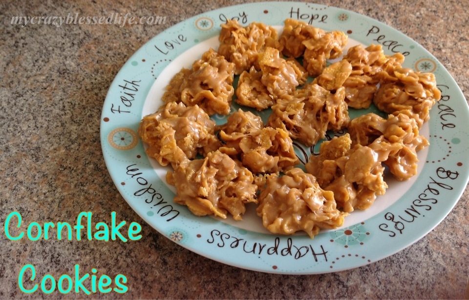 I’m pretty excited for tonight! Every so often I will hostess a girl’s night with some girlfriends at our house. We usually play board games, talk, laugh a lot and enjoy fun snacks we all chip in on. Since it is after the kids bedtime we don’t have a meal. Each of us brings a snack, homemade or store bought doesn’t matter. I like to make something though since I love to bake/cook. This morning my little helpers and I made cornflake cookies!