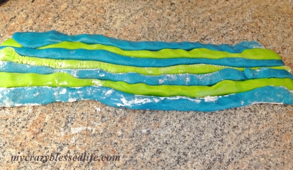 Then I rolled out 5 skinny long ropes of blue cookie dough and 3 green. I placed them every other on the counter.
