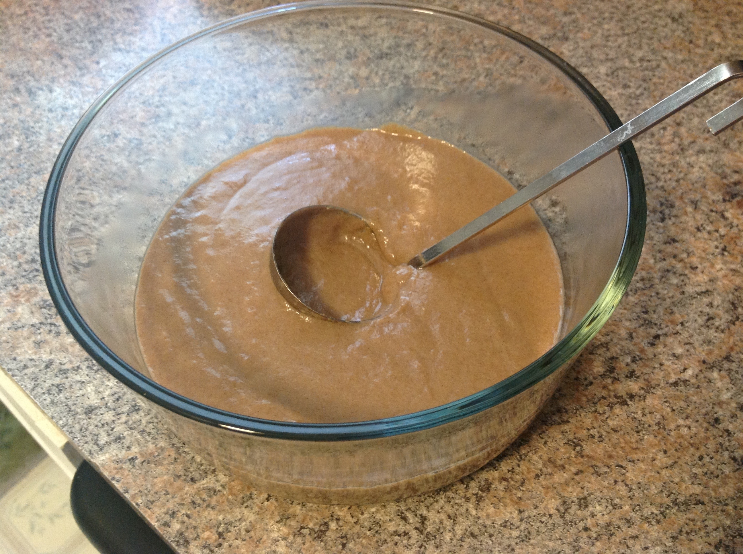 For the icing, whisk together all of the ingredients in a saucepan over medium heat. Stir continuously until the icing coats the back of a spoon like this: