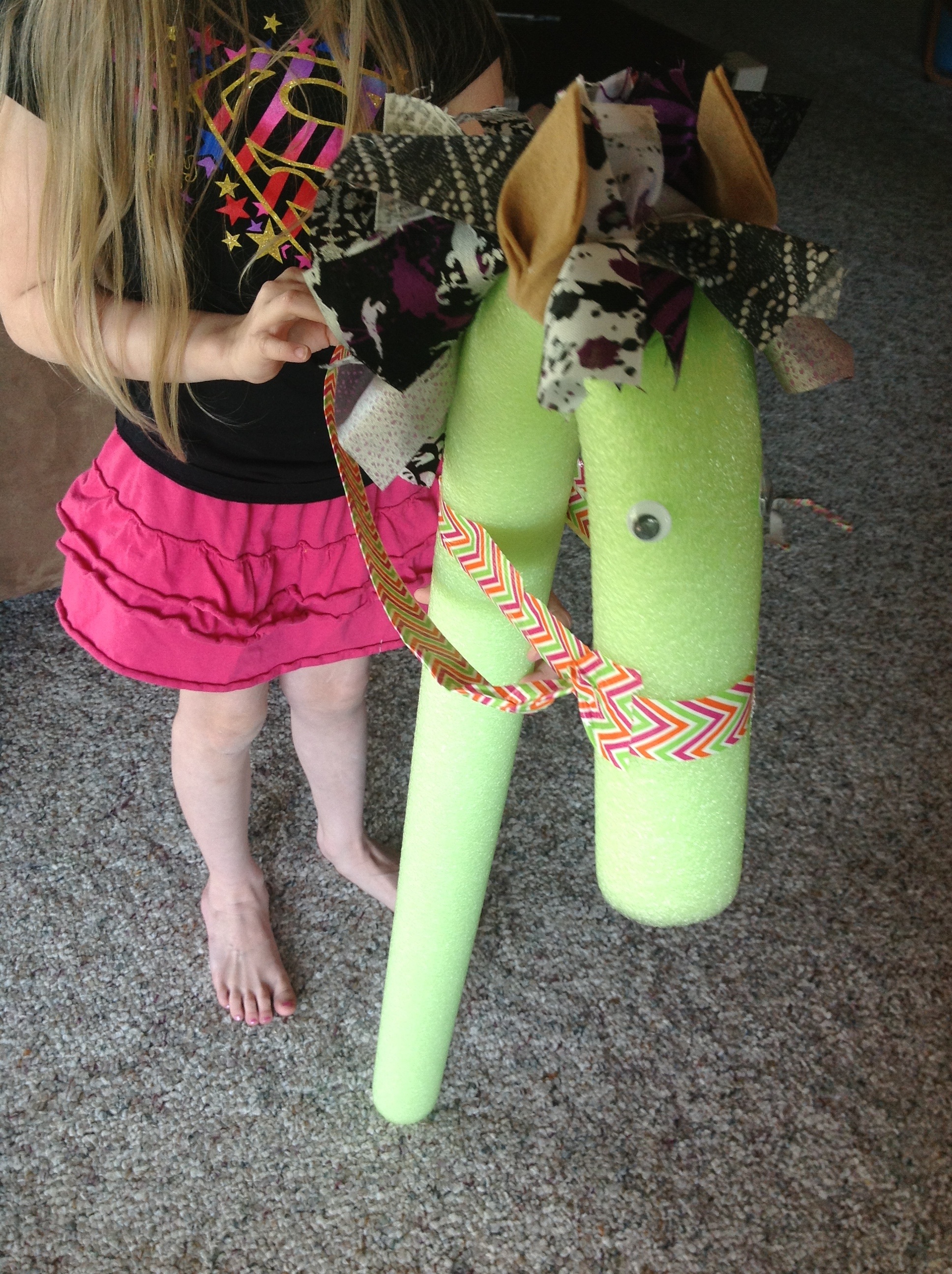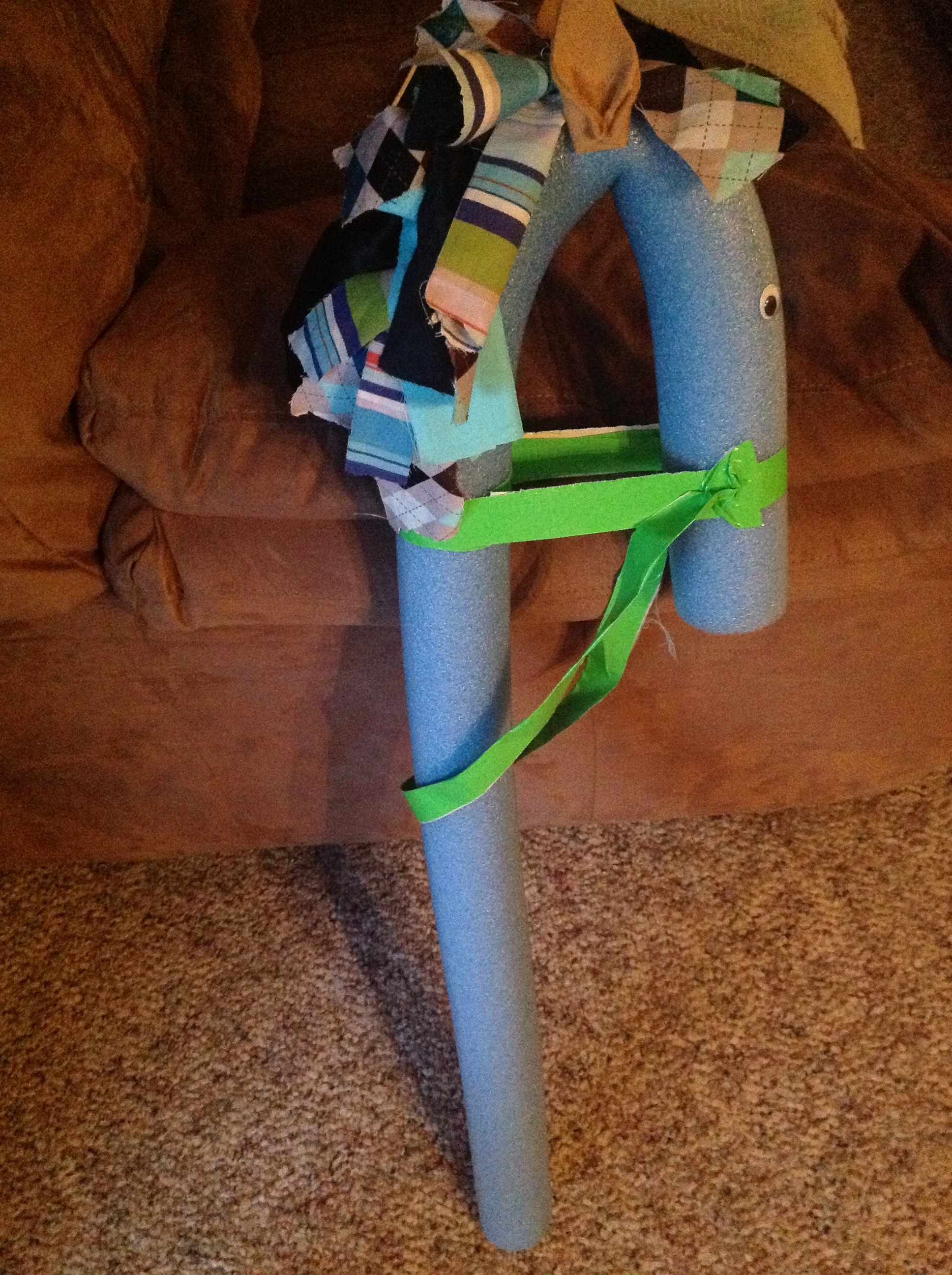 First use the duct tape to make the bridle and reigns. Add googly eyes. Let the kids pick out scrap fabric strips for the adult to hot glue on for mane. Hot glue on some felt ears.