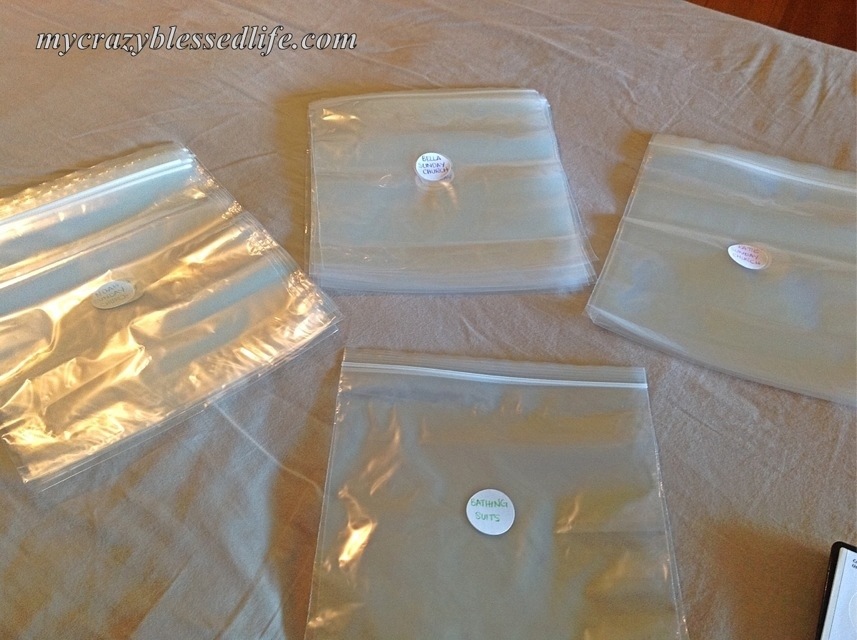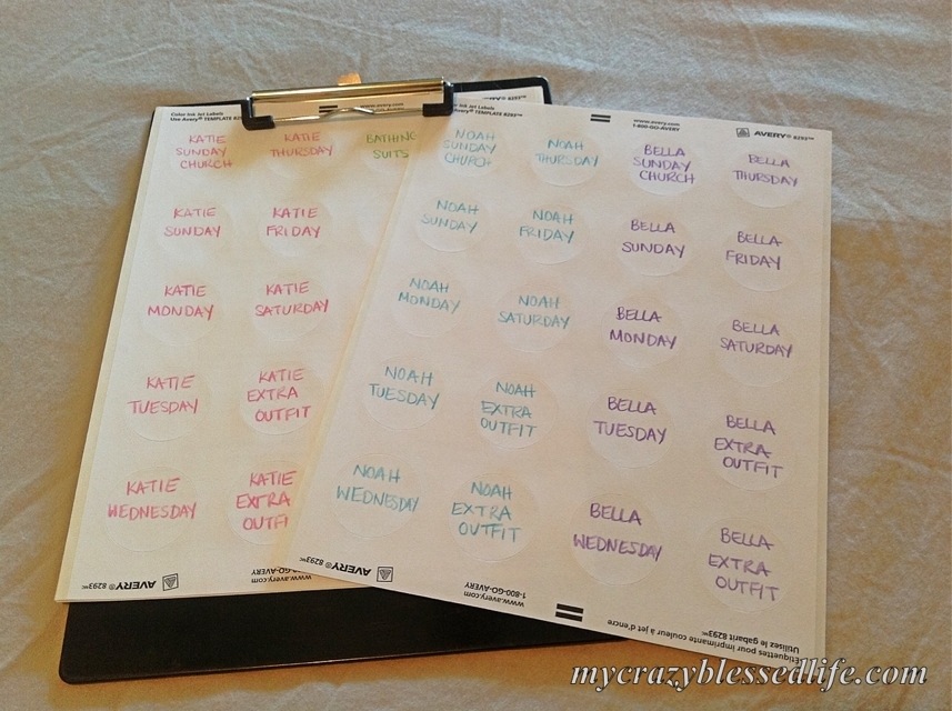 First I use plain labels and write each child a set for the week (or however long we will be gone). I make sure there is an outfit a day, extra outfits, and bathing suit labels. Each child is written in a different color which helps to quickly identify who a bag belongs to, and pre-readers like my 3 year old son can just look for his color bag.