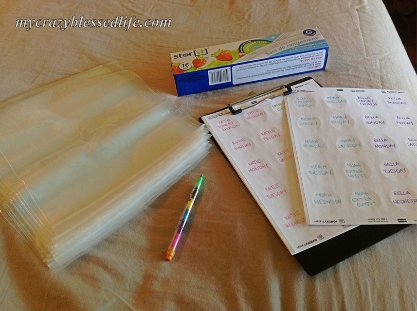 I use gallon size plastic zipper bags and as I mentioned before that I used a colored pencil in different colors for each kid. I could have printed the labels, but I was out of colored ink and it is so much faster for me to write them really quick than design the labels.