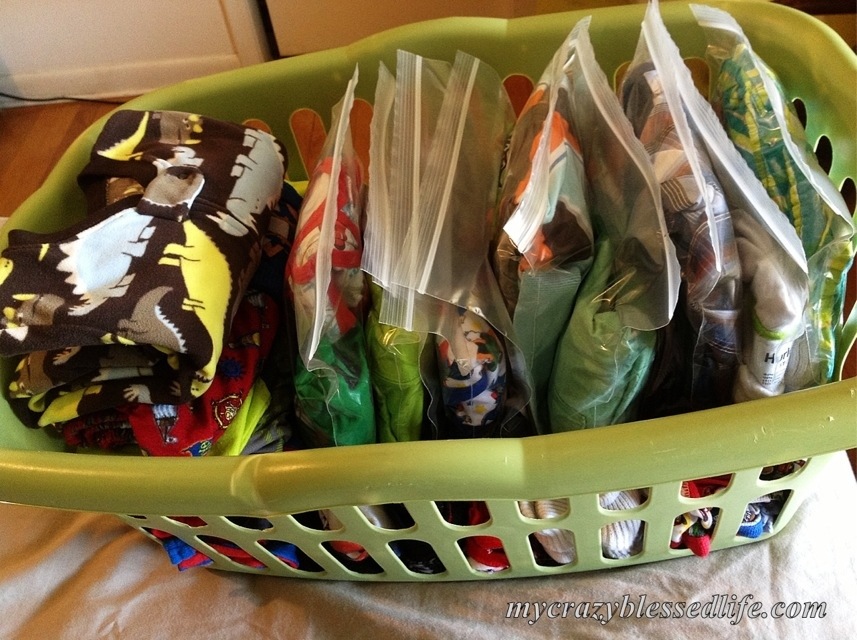 I pack each day with a shirt, shorts/pants, underwear and socks. That way I can hand my kids their bag and they can dress themselves. I don’t have to try and make an outfit or search for matching socks while traveling. It’s done. This also works great when they go visit grandma. She doesn’t know their clothes as well as I do and it just simplifies the whole clothing process. I don’t do this with PJs though I just stack them and they grab a set each night. I put all of this in their own laundry basket for ease also. Wherever we are I unpack their bags, (like into a hotel dresser) and then as they wear their clothes the dirty ones go back into the laundry basket and travel home in the same basket they came in. When we get home all of the baskets head straight to the laundry room for washing.