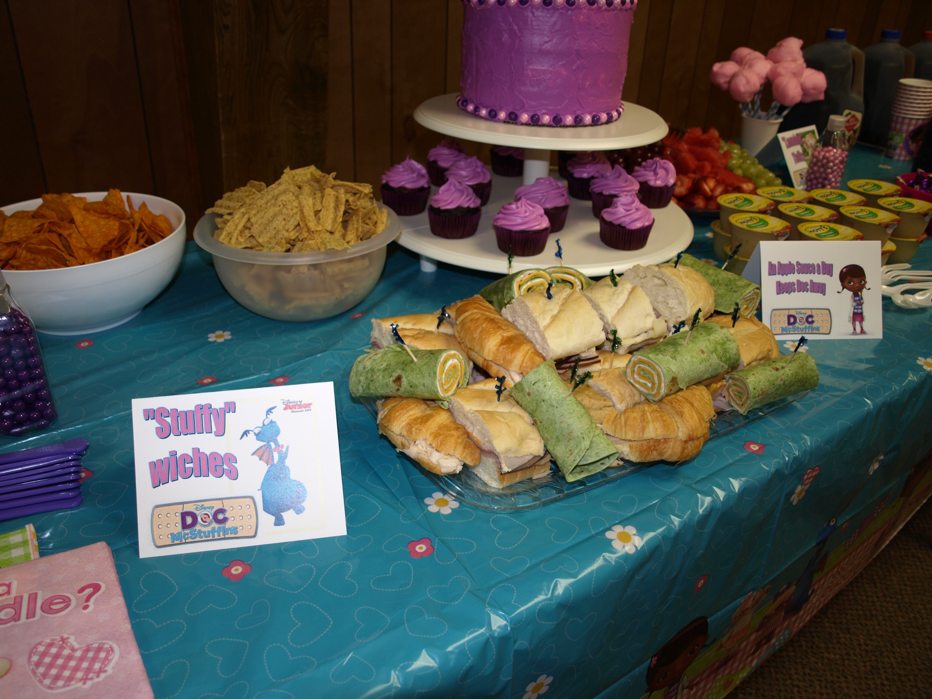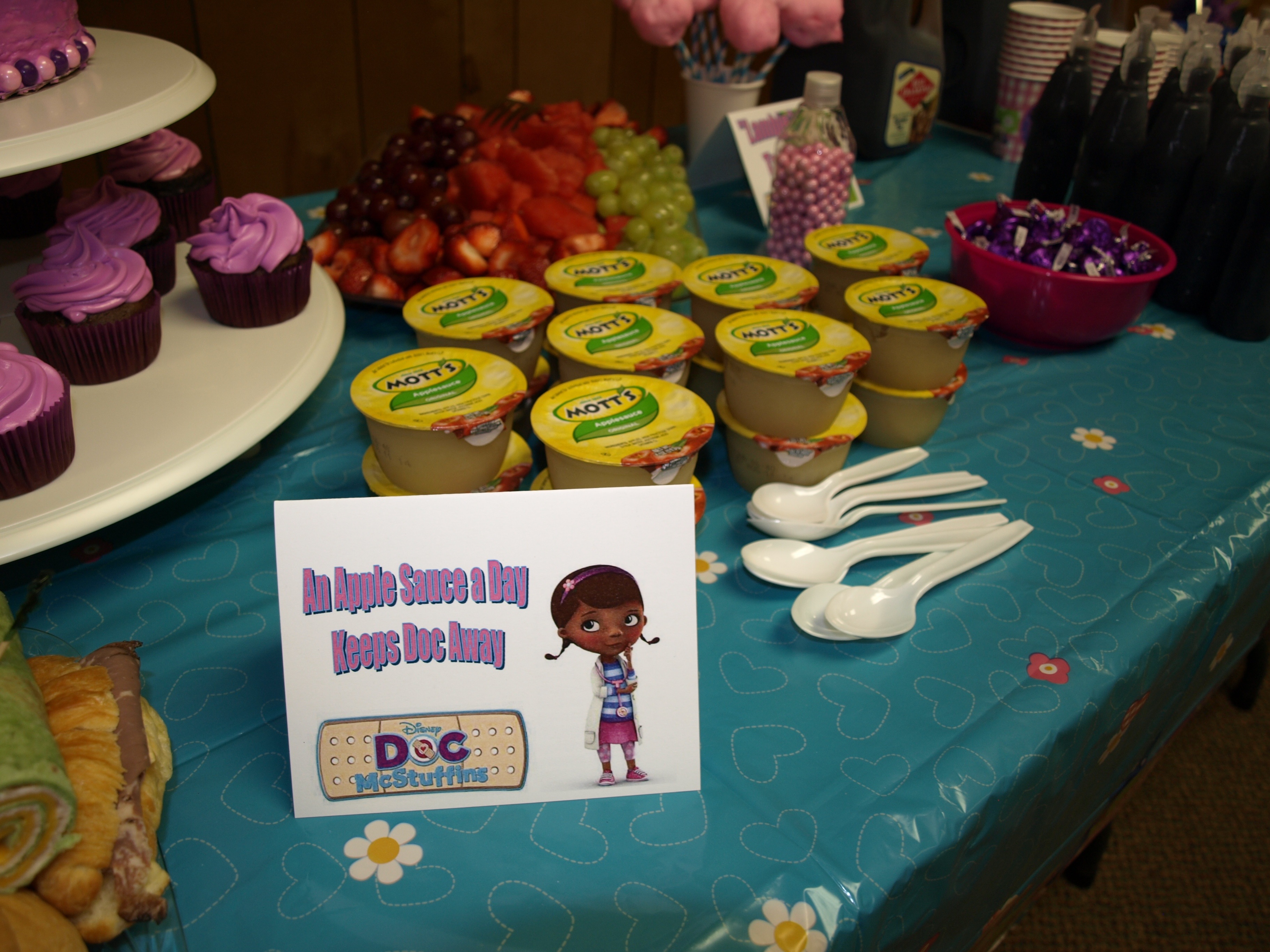 The food tables. First the Doc food table, I really enjoyed making cute little signs for the food to go along with the theme! We had applesauce with the sign, “An apple a day keeps Doc away!” Then for the sandwiches, “Stuffy-wiches.” I made mini cotton candy balls on paper straws and put a sign on them, “Lambie Tails.” Then for the purple juice a sign that said, “Chilly juice.” There were also purple (since that is a Doc color and Belle’s favorite color) kisses that said, “A kiss for your boo boos.”