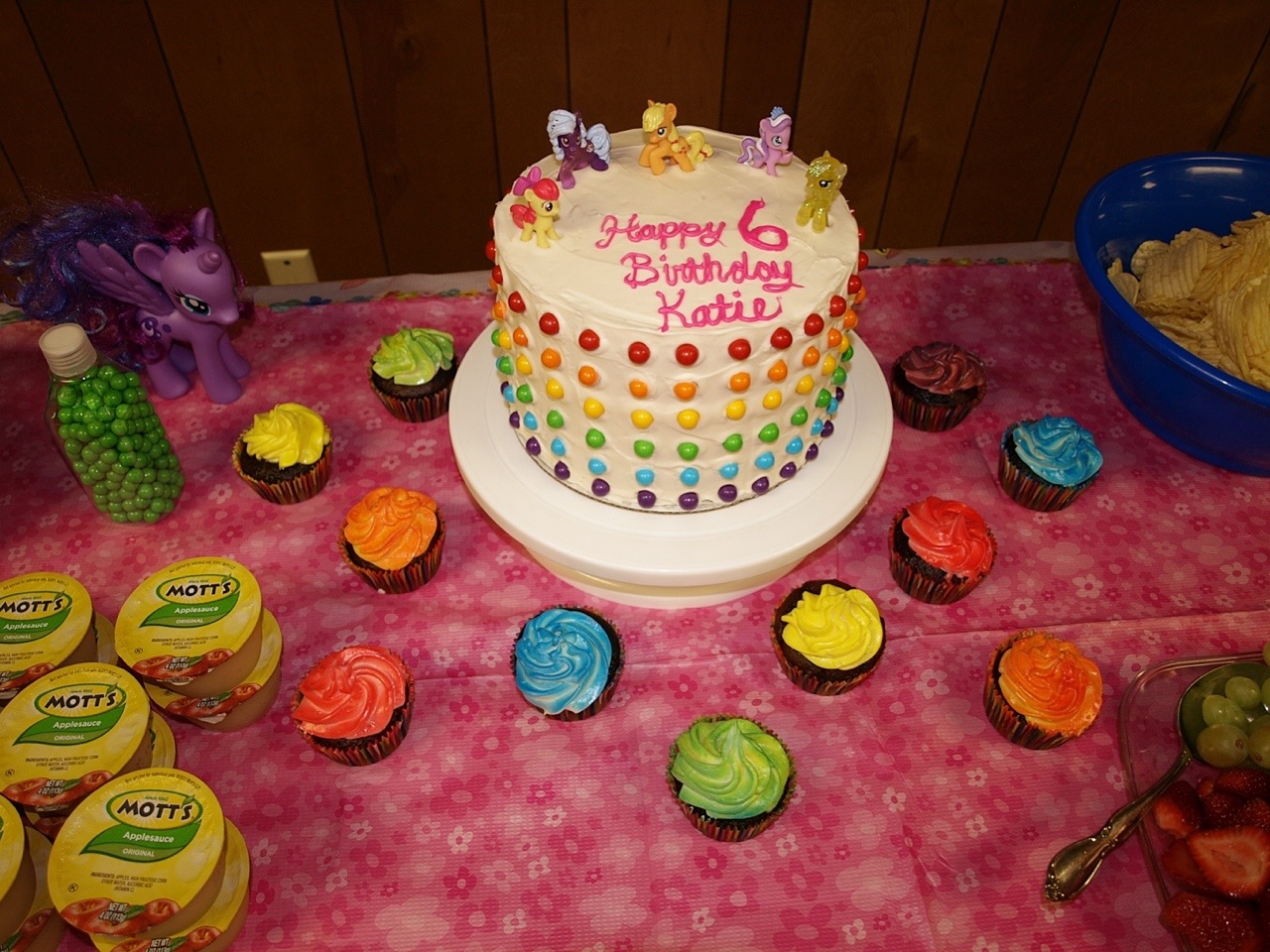 Katherine asked for a funfetti rainbow cake in a My Little Pony theme. So here is what I made, a three layer funfetti cake with white butter cream frosting and rainbow sixlets all around it. Again, I added some chocolate cupcakes to match for my fellow chocolate cake lovers. She loved it 🙂 Side note… please excuse the #6 sparkler candle it spun around backwards and I didn’t notice it until after the pic.