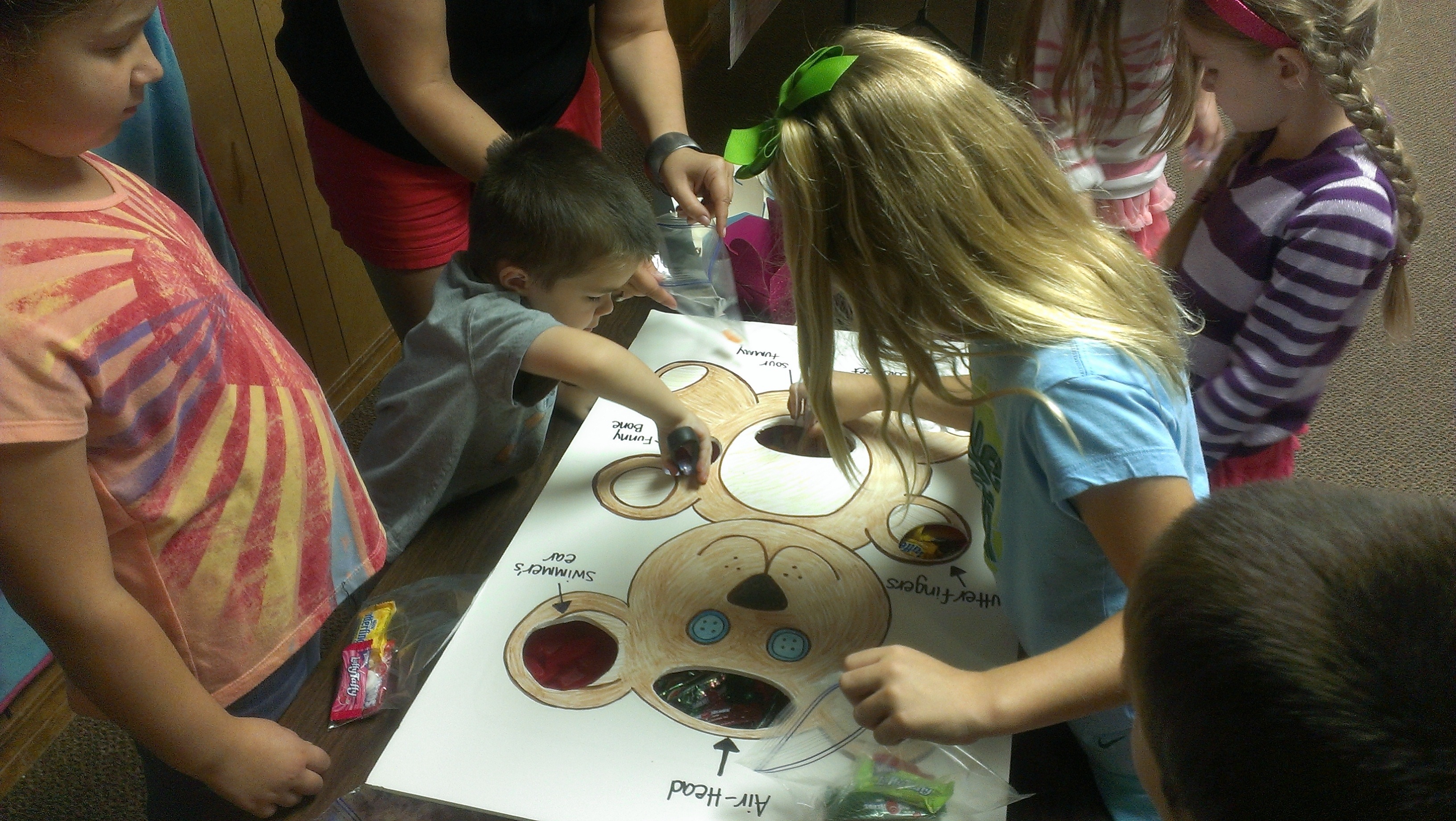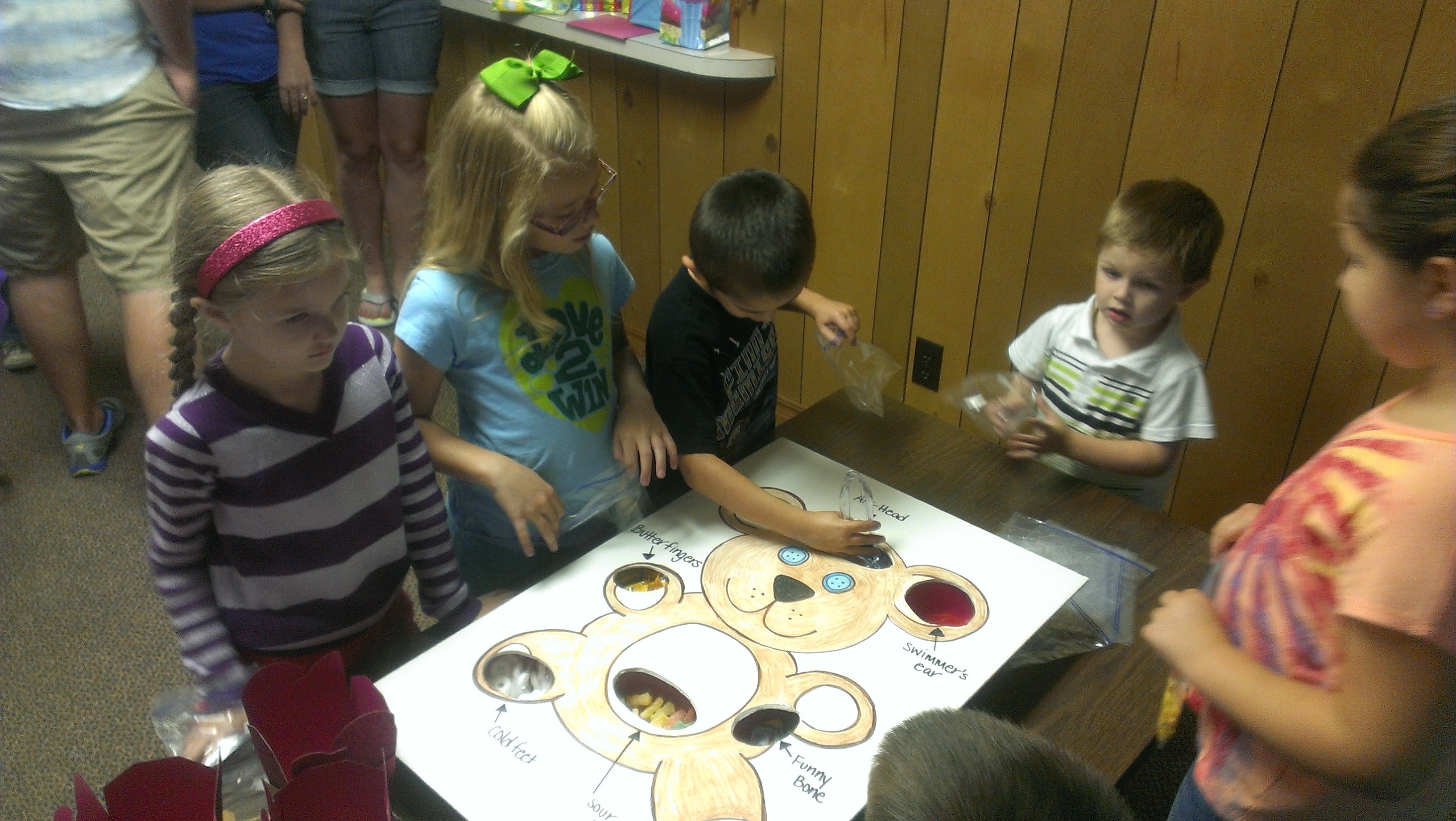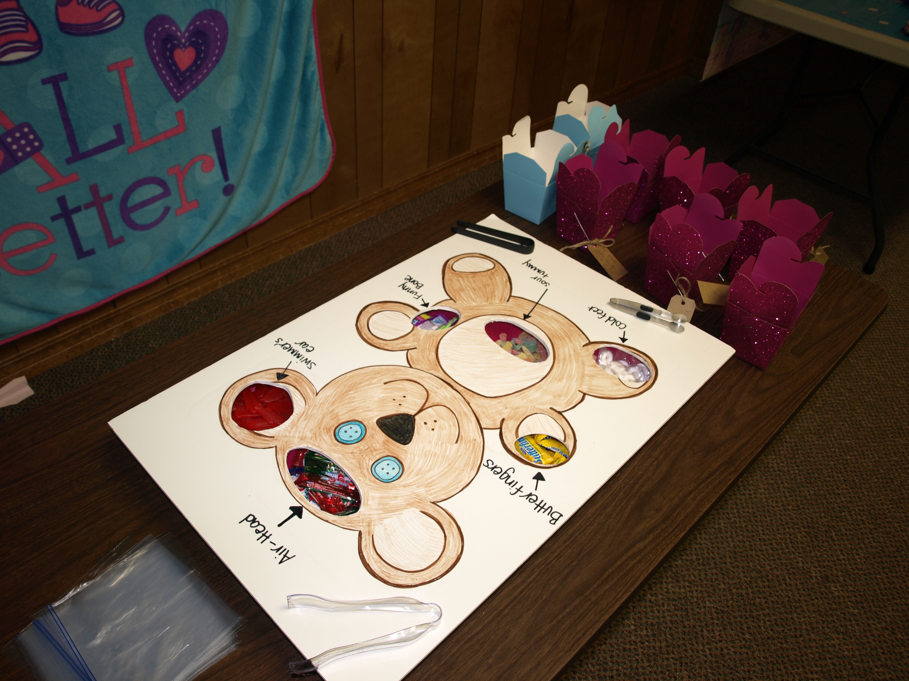 The bear is hand drawn by me on foam board, colored and cut out small circles for the candy. The head has the sign, “Airhead” and is a small bowl with little airhead candies inside. The ear is labeled, “Swimmer’s Ear” and has Swedish fish in a small bowl. The elbow is labeled, “Funny Bone” and has laffy taffy in a small bowl. The stomach is labeled, “Sour Tummy” and has sour patch kids in a small bowl. The foot is labeled, “Cold Feet” and has individually wrapped wintergreen lifesavers inside a small bowl. The hand is labeled, “Butterfingers” and has a small bowl full of mini butterfingers candy bars. I think the kids loved it!